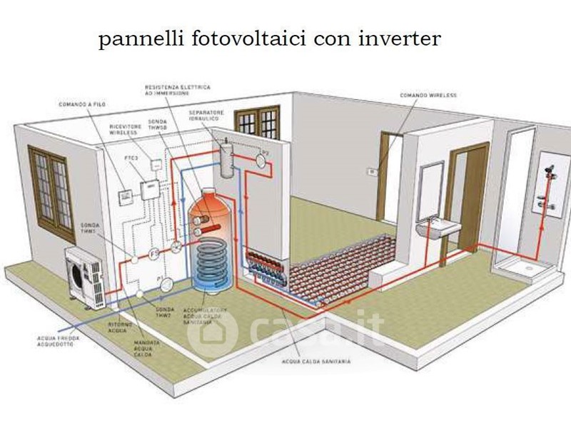 La soluzione è dotata di riscaldamento A PAVIMENTO con pompa di calore che produce anche raffrescamento. Ventilazione meccanica per riciclo dell'aria, impianto fotovoltaico, videocitofono.