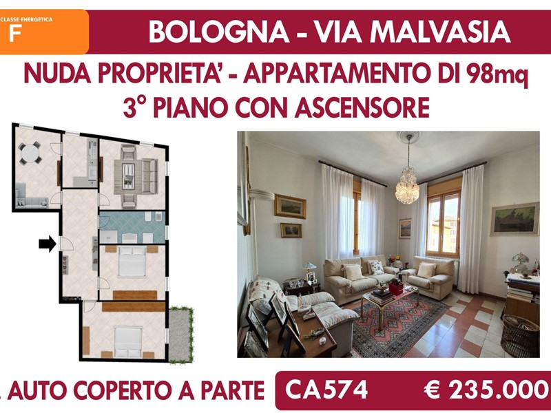 Bologna - Saffi - Via Malvasia: appartamento quadrilocale di 98mq in NUDA PROPRIETA' (usufruttuaria di 91 anni), sito al terzo piano con ascensore. Ingresso arredabile, cucinotto, tinello, soggiorno (o terza camera), due camere da letto matrimoniali di cui una con balcone, bagno, cantina. Riscaldamento autonomo, impianto di climatizzazione, APE:F. Rif. CA574 Euro 235.000. Possibilità di acquistare a parte un posto auto coperto.