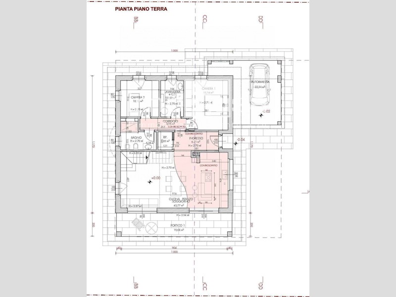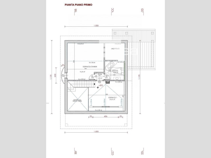 La soluzione proposta prevede al piano terra zona giorno open-space di quasi 45 mq, due camere, due bagni, lavanderia e rispostiglio, al piano primo terza camera, terzo bagno ed ampio soppalco.