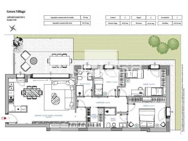 L'immobile è cosi' distribuito: zona giorno/pranzo con angolo cottura di circa 40 mq, disimpegno, tre camere letto di cui due superiori ai 14 mq, due bagni, ripostiglio/lavanderia. Ampio giardino di proprieta' con splendido plateatico collegato alla zona giorno. Completano la proposta garage e magazzino.