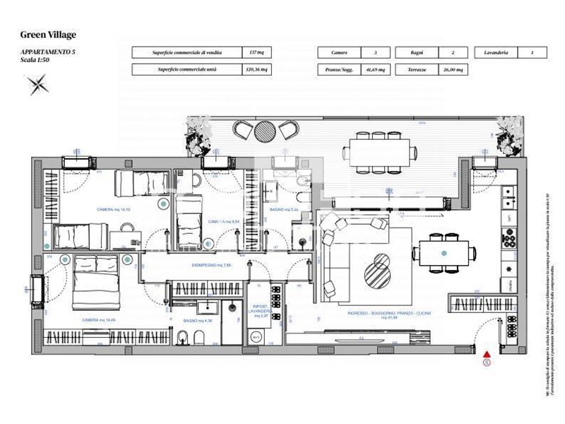 L'immobile è cosi' distribuito: zona giorno/pranzo con angolo cottura di 42 mq ottimamente distribuiti, disimpegno, tre camere letto di cui la principale con bagno personale, secondo bagno e lavanderia/ripostiglio. Splendida terrazza fruibile dalla zona giorno e da una camera. Completano la proposta il garage ed il posto auto assegnato in proprieta'.