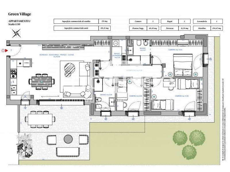 L'immobile è cosi' distribuito: zona giorno/pranzo con angolo cottura di oltre 40 mq, disimpegno, tre camere letto di cui la principale con bagno personale, secondo bagno, ripostiglio/lavanderia. Ampio giardino di proprieta' con splendido plateatico collegato alla zona giorno. Completano la proposta garage e magazzino.