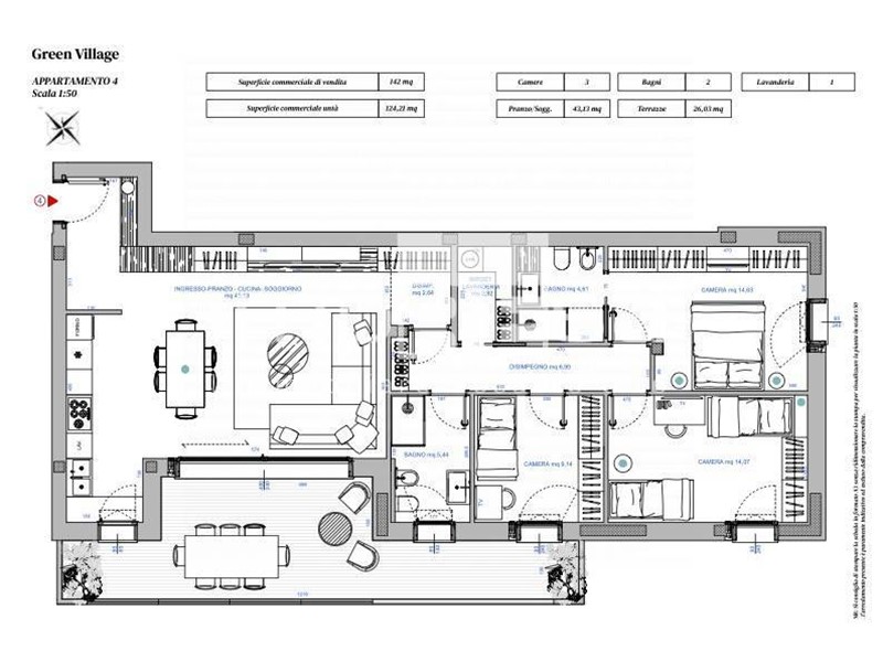 L'immobile è cosi' distribuito: zona giorno/pranzo con angolo cottura di oltre 43 mq, disimpegno, tre camere letto di cui la principale con bagno personale, secondo bagno e lavanderia/ripostiglio. Splendida terrazza fruibile dalla zona giorno con ampio serramento scorrevole e da una camera. Completano la proposta il garage, il magazzino ed il posto auto assegnato in proprieta'.