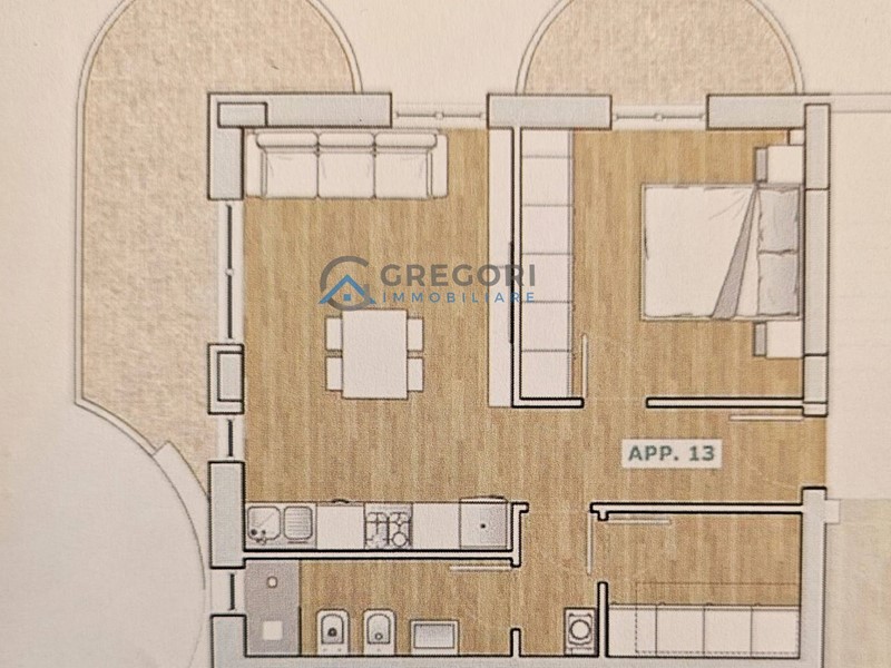 L'appartamento, di circa 63 mq, è composto da tre locali, tra cui una luminosa camera da letto, un ampio soggiorno con cucina a vista, una seconda stanza ed un bagno moderno e funzionale.