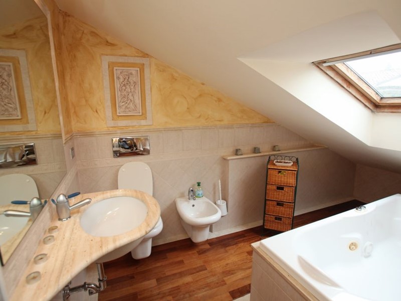 Infine la mansarda di 55 mq tutta pavimentata in parquet in legno Iroko, con riscaldamento a terra, dotata di due lucernari Velux e di una finestra di 2m di lunghezza con forma ad arco; anche in questo piano cè la predisposizione per un eventuale camino e per laria condizionata.
