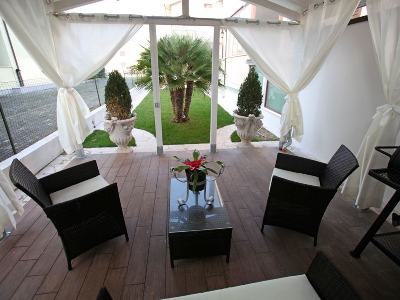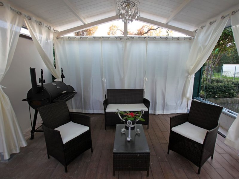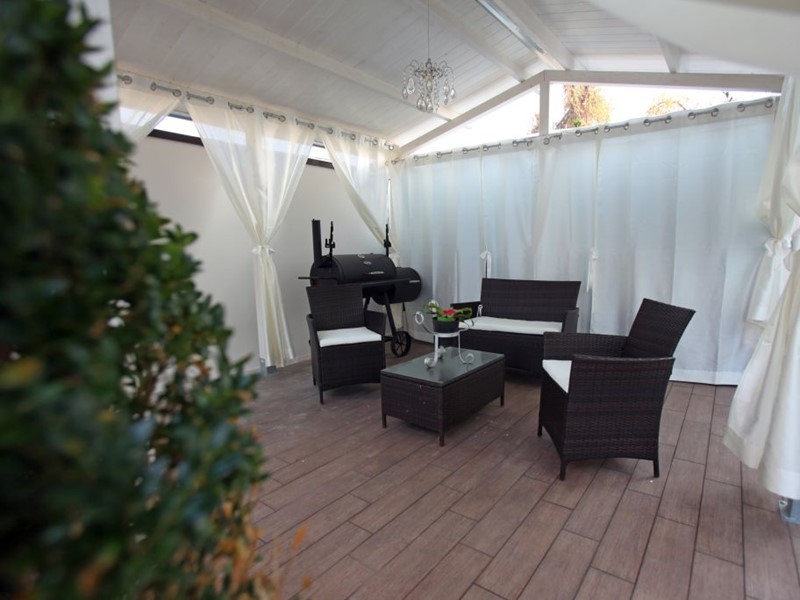 La casa è circondata da un giardino di circa 200 mq, ottimamente attrezzato, allinterno del quale si trova un gazebo di 16 mq, piastrellato con gres porcellanato effetto legno antisdrucciolo. Il giardino è dotato di illuminazione sia a parete che a terra per ciascuna aiuola e con accensione con telecomando; è inoltre dotato di irrigazione automatica computerizzata a pavimento.