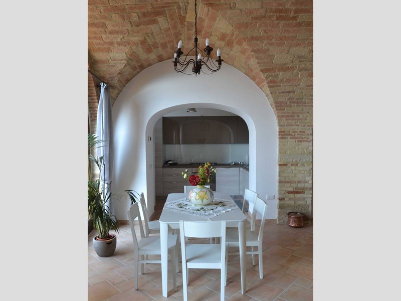 L'appartamento si trova in perfette condizioni, caratterizzato da pareti ad arco con mattoni faccia vista, infissi in legno, persiane in alluminio finto legno, doppi vetri, riscaldamento autonomo.