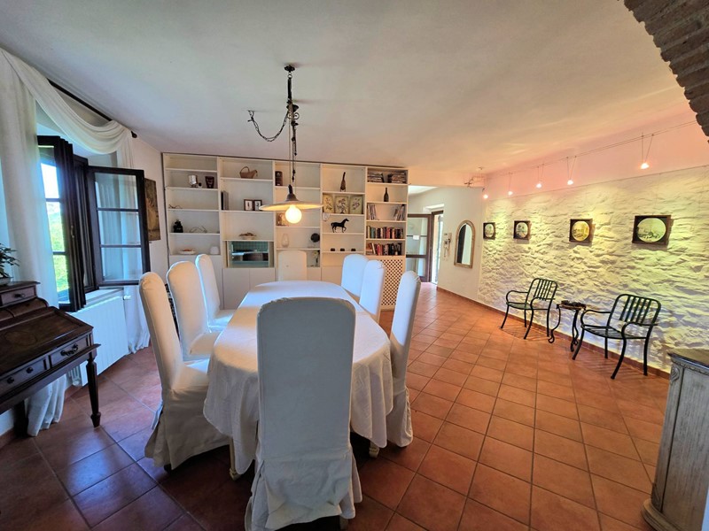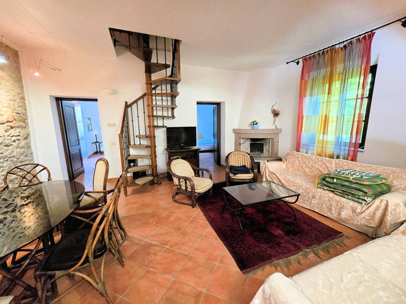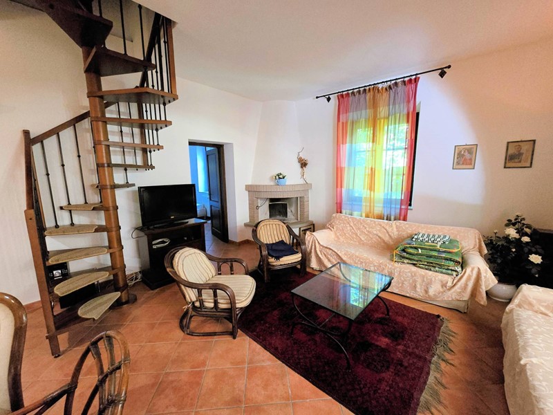 Salendo le scale esterne troviamo il secondo appartamento composto da ampio corridoio, sala da pranzo, soggiorno con caminetto con accesso ad un balconcino coperto, cucina e camera matrimoniale con grande bagno, piccolo wc. Inoltre una scala interna a chiocciola collega i due piani della villa.