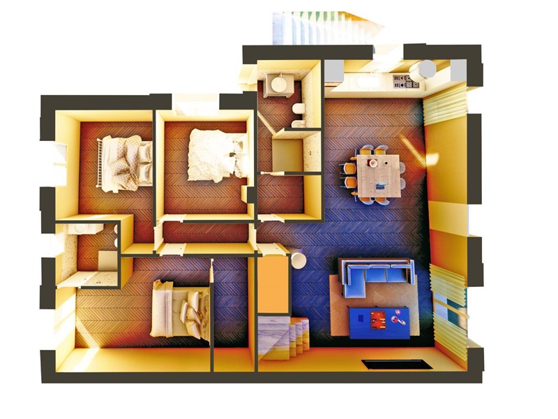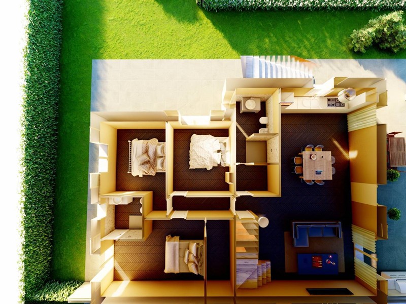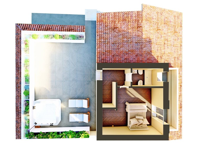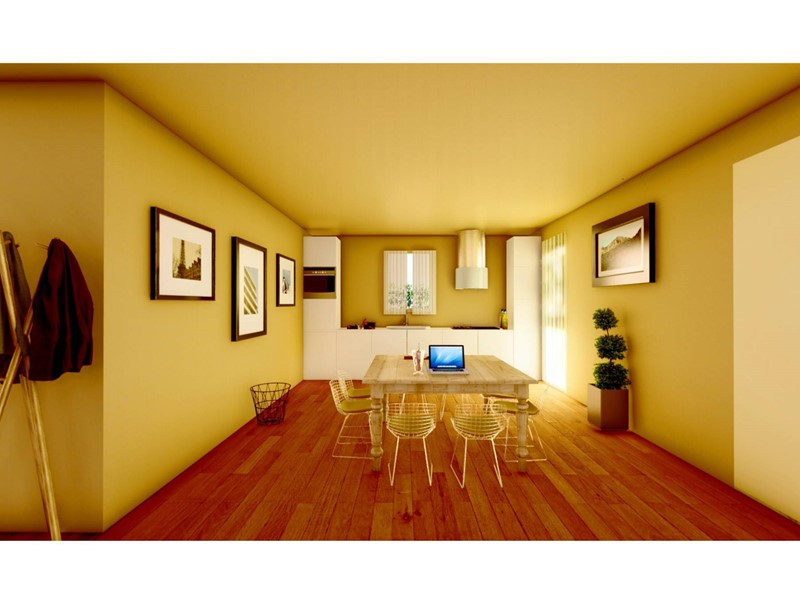 Allinterno è composto da un grande Soggiorno Cucina Pranzo di circa 50 mq, collegato direttamente al grande portico esterno di circa 30 mq.