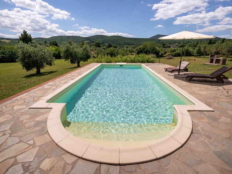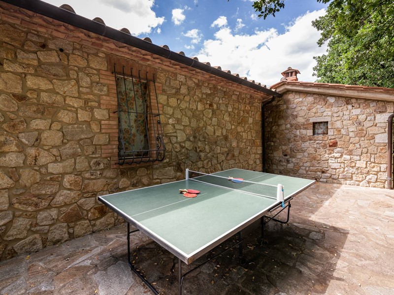 Completa il tutto la piscina 9x4 con altezza da 1,2 m a 1,5 m con solarium e gazebo, attrezzata con lettini prendisole, tavolo in legno e doccia esterna. Nel caratteristico giardino circondato da piante di olivo e alberi da frutto è possibile utilizzare un barbecue in muratura per grigliate.