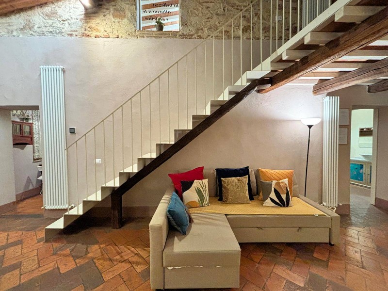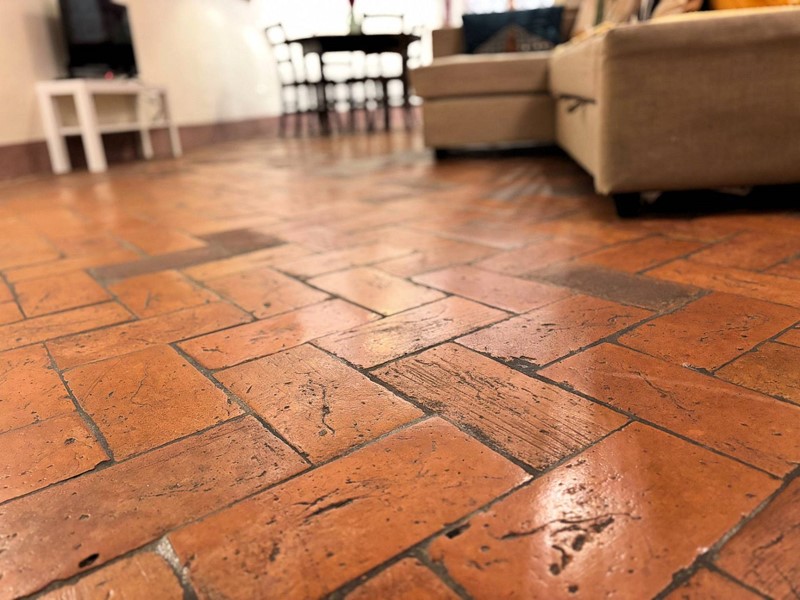 Pavimenti in cotto nella zona giorno e pavimento in legno al piano superiore.