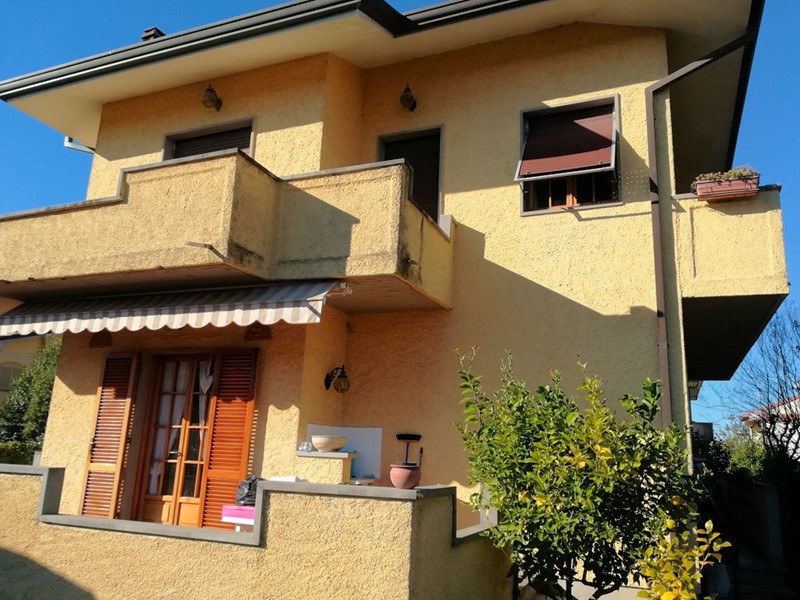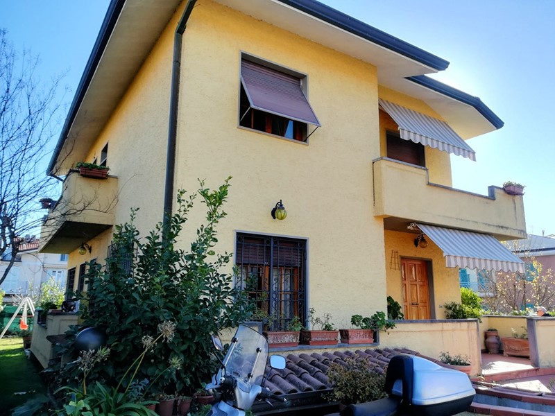 Vendesi villa di circa 210 mq. con giardino, libera sui 4 lati, disposta su più livelli, costruita nel 1975, distante dal mare circa 700 ml. e circa 1700 ml. dal centro di Marina di Massa. La zona è molto tranquilla, infatti per decenni è stata la meta preferita da molti turisti che trascorrevano le vacanze estive prendendo in affitto case da privati. Col passar del tempo e col proliferare delle costruzioni, molti di questi hanno deciso di acquistare, secondo i loro gusti e la diversità dellofferta, o lappartamento oppure la casa singola, attratti principalmente dalla vicinanza e dalla bellezza del mare rapidamente raggiungibile. A fare da sfondo a tutto ciò, dai terrazzi della casa si possono ammirare le Alpi Apuane che contribuiscono a creare quel microclima mite per la maggior parte dellanno tipico della costa apuo-versiliese. Si accede alla villa da cancello carraio in ferro battuto automatizzato, con 2 livelli di apertura. Comodo parcheggio in lastre di cardoso per n. 3-4 auto, ingresso principale e vialetto per ingresso secondario lato sud-ovest. Il giardino è circa 100 mq. adornato da ulivi e piante ornamentali. Impianto dirrigazione parziale, illuminazione con sfere da giardino. La struttura presenta un piano terra rialzato (3 gradini), piano primo e cantina con accesso da scala interna. Nel 2005 la pavimentazione in monocottura al piano terra è stata completamente rimossa e sostituita con pavimento in granito. Al primo piano sono rimasti i pavimenti e rivestimenti originali in monocottura esclusa la camera principale che ha la moquette. I serramenti alle finestre e porte finestre sono in douglas colore originale con telaietti stile inglese e avvolgibili in pvc colorato. Particolare interessante, tutte le aperture del piano terra sono protette con grate di ferro battuto fisse, ad eccezione del portoncino dentrata principale e porta entrata secondaria. La scala interna che porta sia in cantina che al primo piano è tutta in legno, alzate, pedate e passamano. Tutti gli ambienti sia al piano terra sia al primo piano hanno laccesso a terrazzi con passamano in pietra serena e pavimenti in cotto da esterni.