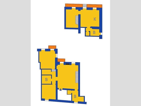 L' attuale configurazione dell' appartamento prevede un ampio soggiorno con camino, due camere, due bagni, un disimpegno con armadi al primo piano, una grande cucina conviviale, una cameretta passante, un terzo bagno ed una dispensa al piano sottostante.