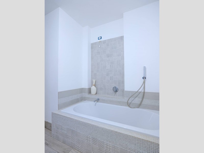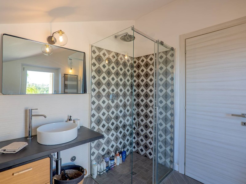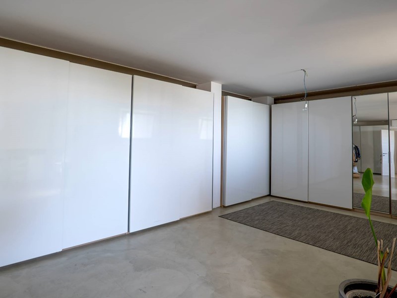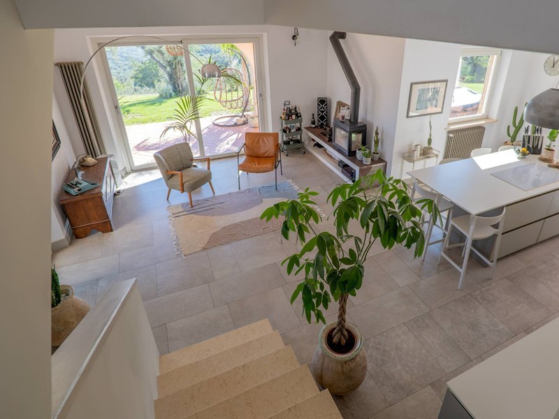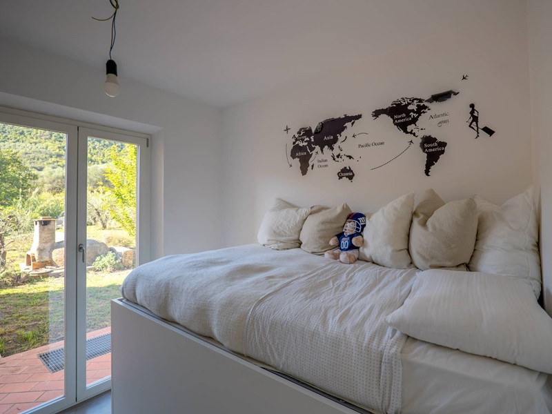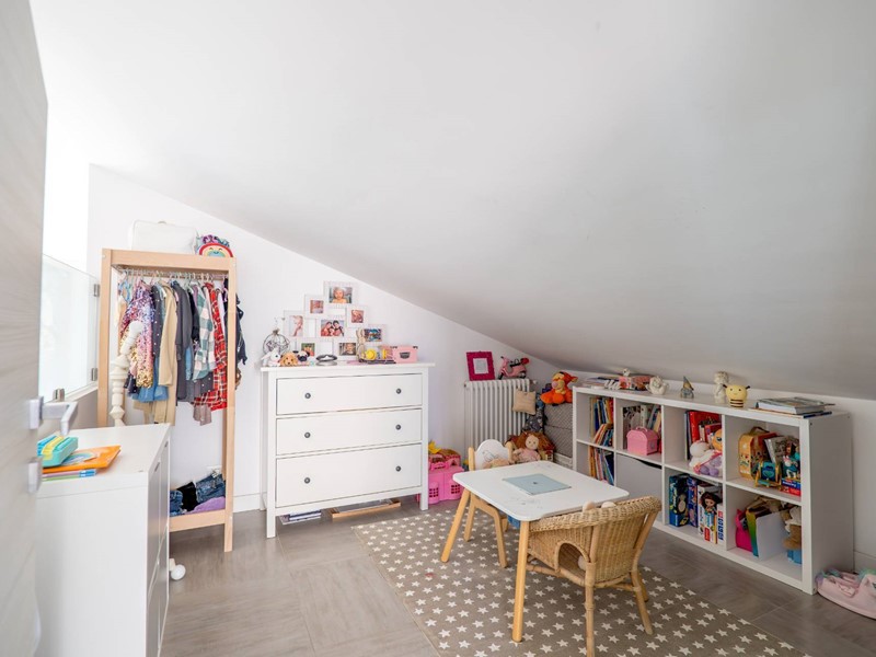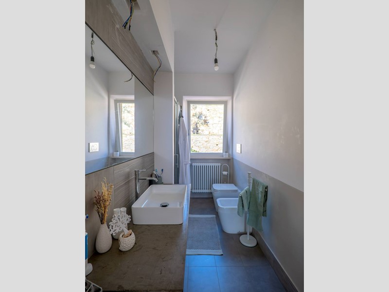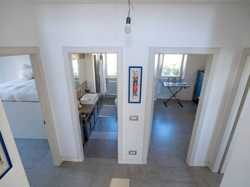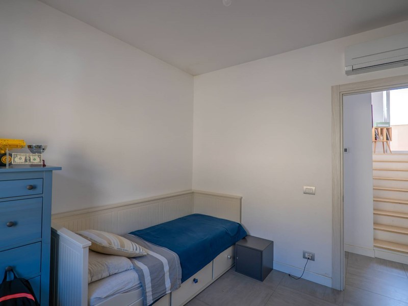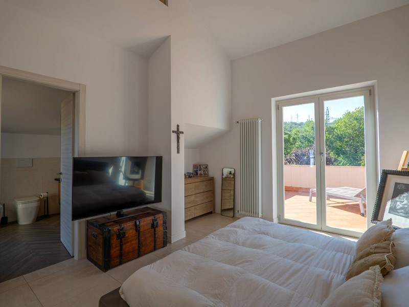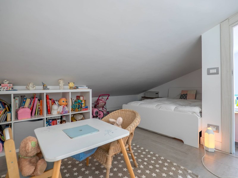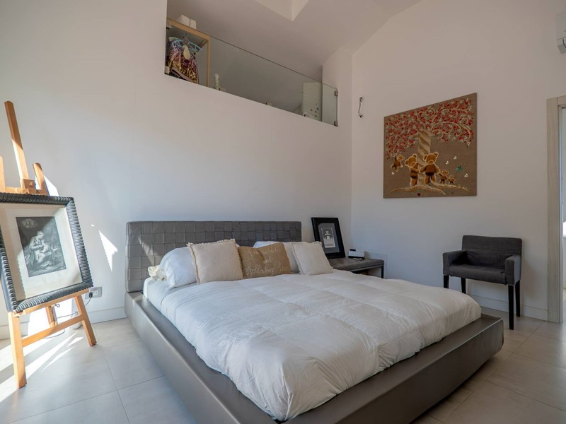 La suite padronale al piano superiore, con un bagno privato raffinato e dettagli di design, all'interno della quale una scala conduce a una camera mansardata, perfetta per i piccoli della famiglia o uno studio.