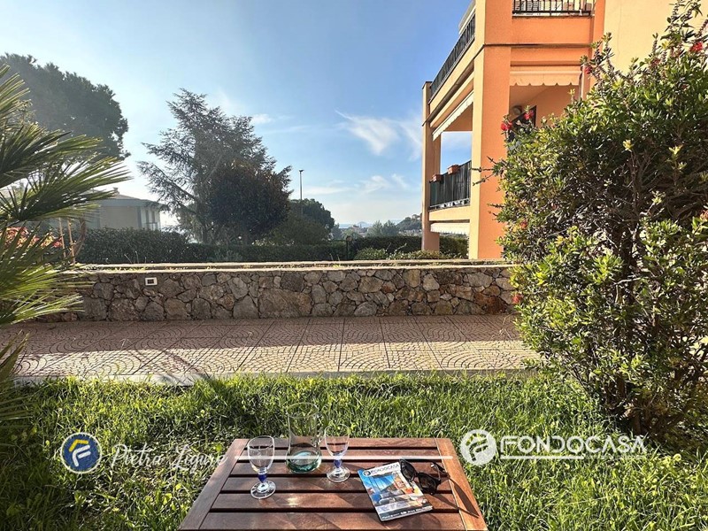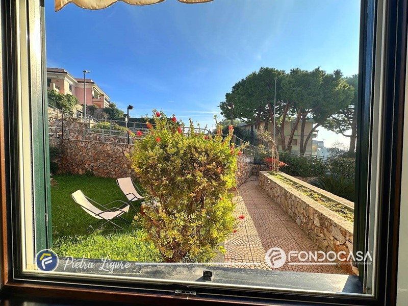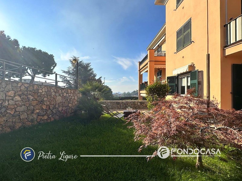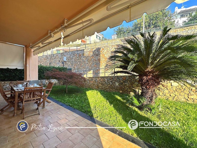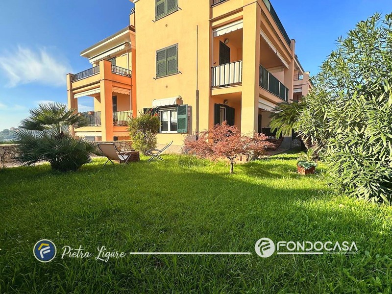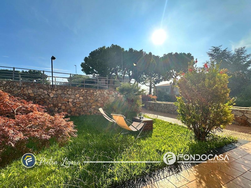 BILOCALE CON GIARDINO, PORTICATO, BOX AUTO E CANTINA IN VENDITA A PIETRA LIGURE.