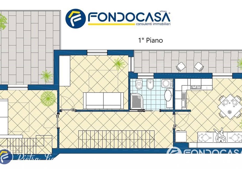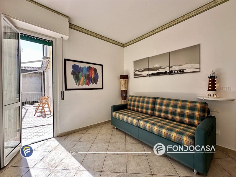 Entrando dal piano terra una comoda scala in muratura ci accompagna al primo piano dove si sviluppa la parta principale della proprietà, composta da soggiorno con cucina a vista e balconata privata, salotto con ampia terrazza dalla vista aperta e con un prezioso scorcio di mare, camera da letto, bagno con doccia e finestra, ripostiglio!