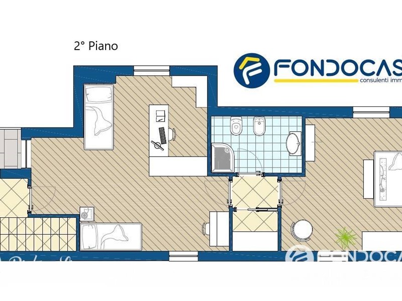 Una larga e pratica scala in legno ci accompagna al piano superiore che ci accoglie in tutta la sua ampiezza e luminosità. E' ornato dal pavimento in parquet e composto da unimponente camera da letto con balcone panoramico, dove gli spazi sono stati sapientemente suddivisi dal mobilio per creare spazi distinti, unaltra spaziosa camera da letto, bagno con doccia e velux, ripostiglio.