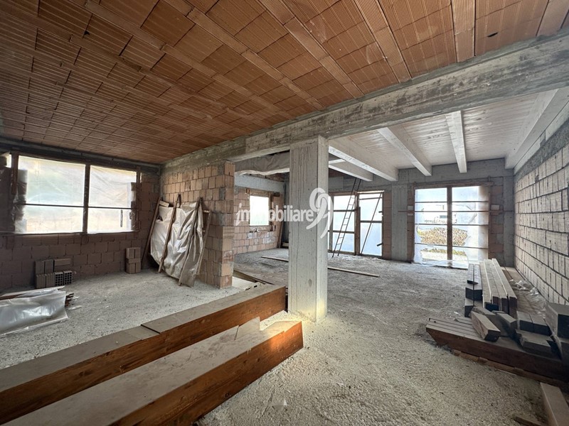 Piano Terra: Camera matrimoniale, camera singola, un bagno, disimpegno, ampio soggiorno e cucina abitabile, portico con travi in legno, presenti ma non montata.