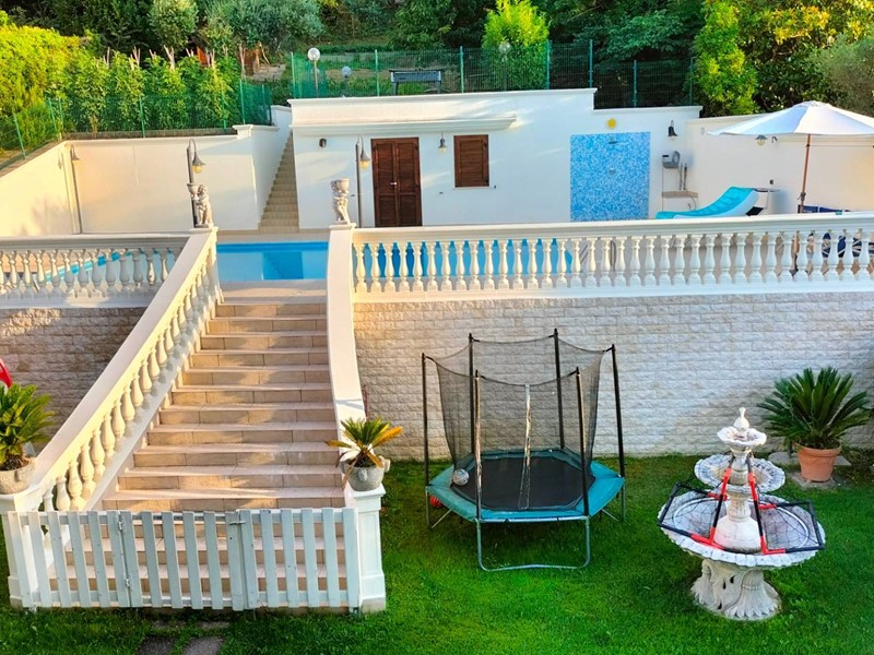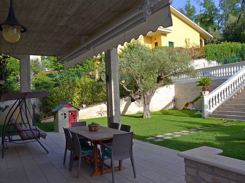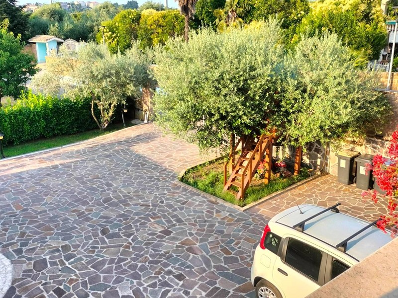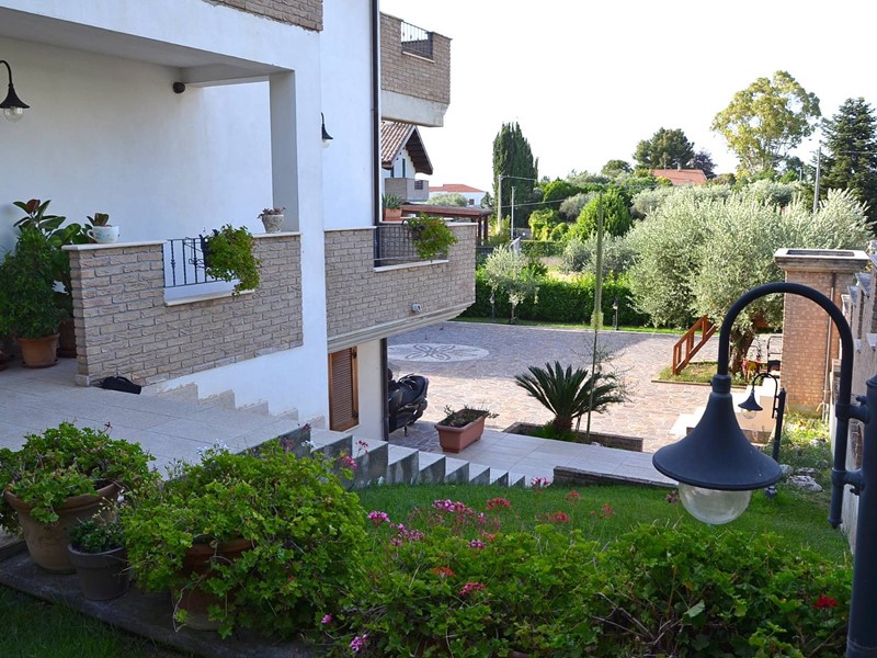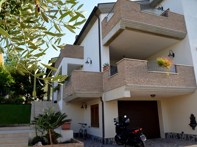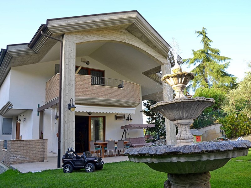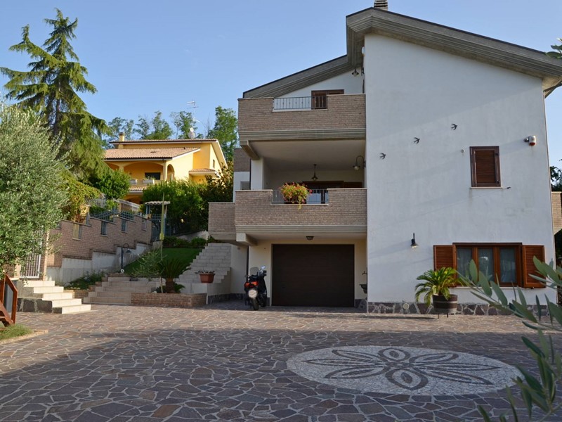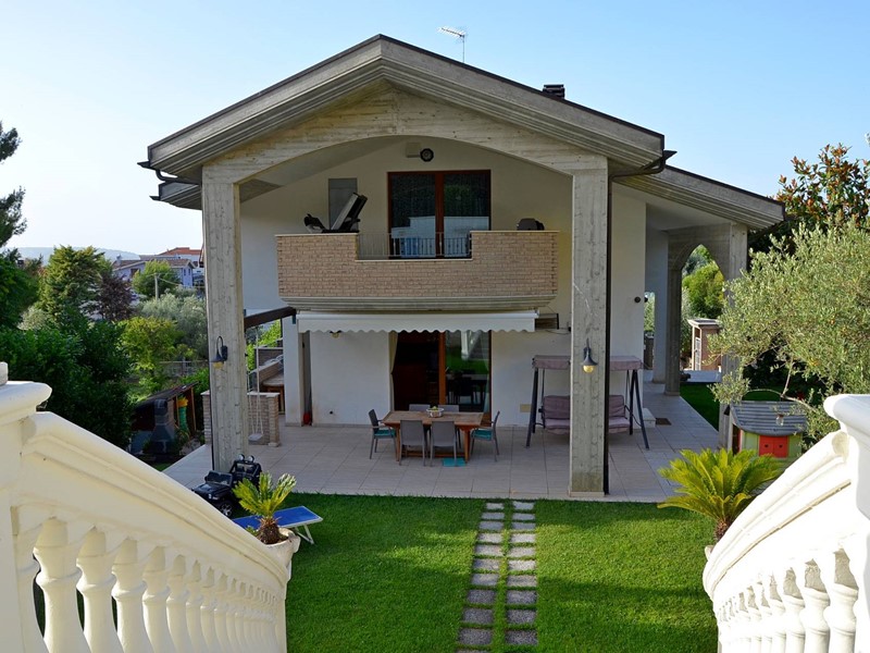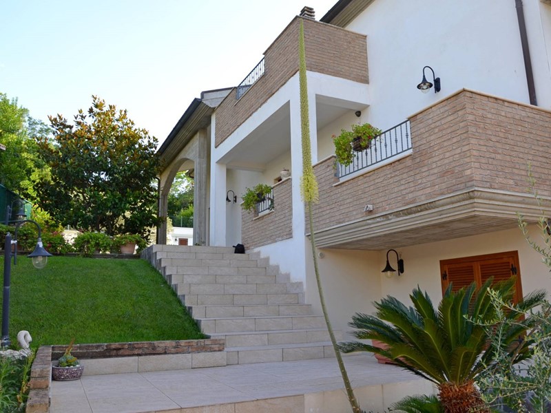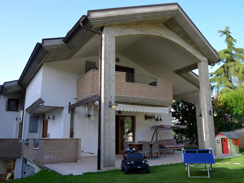 Villa con piscina in Montesilvano Colle, zona residenziale non isolata. La villa si sviluppa su tre livelli, al livello seminterrato troviamo ampia taverna con accesso anche indipendente ideale per serate conviviali, garage, cantina, e locale di sgombero ; Primo livello residenziale composto da ingresso soggiorno, cucina aperta con zona pranzo con camino e accesso sul giardino superiore che conduce alla piscina, camera, camera matrimoniale con bagno e guardaroba, bagno con doccia; secondo livello mansardato residenziale, composto da ingresso soggiorno con cucina a vista, area pranzo e due terrazzini di cui uno con bella vista sulla piscina, la zona notte è composta da due camere con balcone e due bagni. Il giardino è diviso in tre livelli, il più basso quasi completamente pavimentato adibito soprattutto al parcheggio di auto scoperto e coperto. Il secondo livello del giardino è quello del primo piano residenziale ed è attrezzato a spazio conviviale e giochi, da questo giardino una scalinata conduce al livello superiore dove troviamo una piscina 5 x 10 metri attrezzata, altra scala conduce all'ultimo livello attrezzato ad orto biologico.