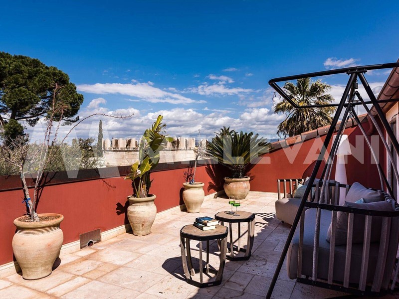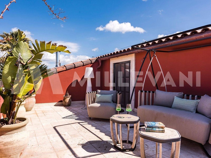 Dal salone, tramite scala in legno interna, si accede al primo piano composto da una suite con camera da letto matrimoniale, bagno con vasca, cameretta, che può tranquillamente diventare una cabina armadio e terrazzo da cui si può godere di una meravigliosa vista panoramica.