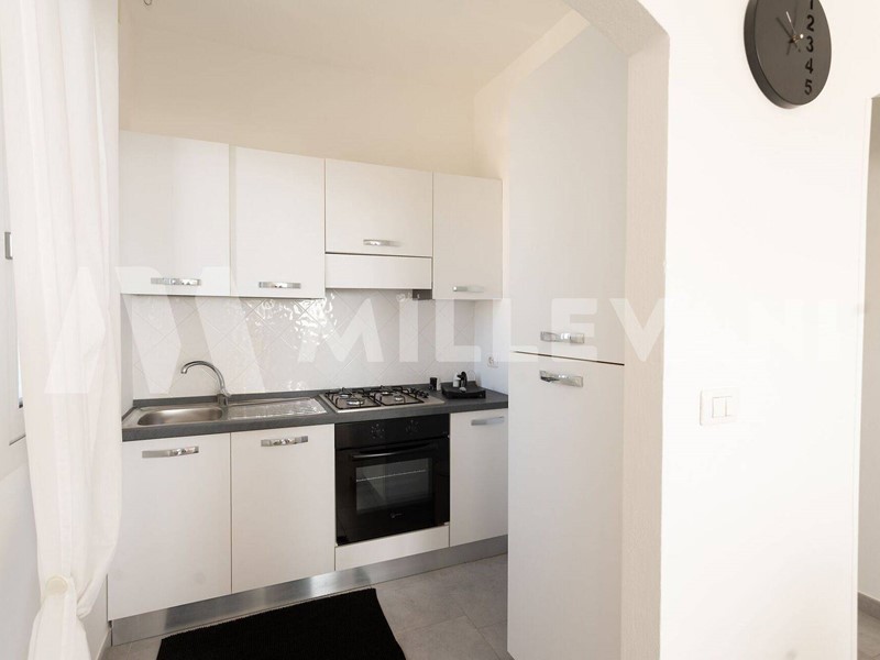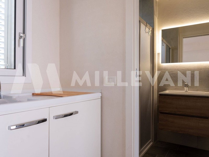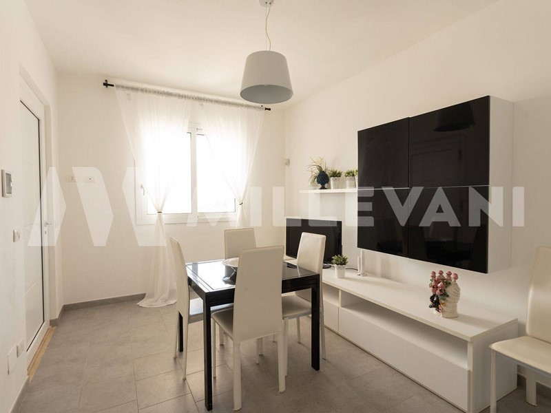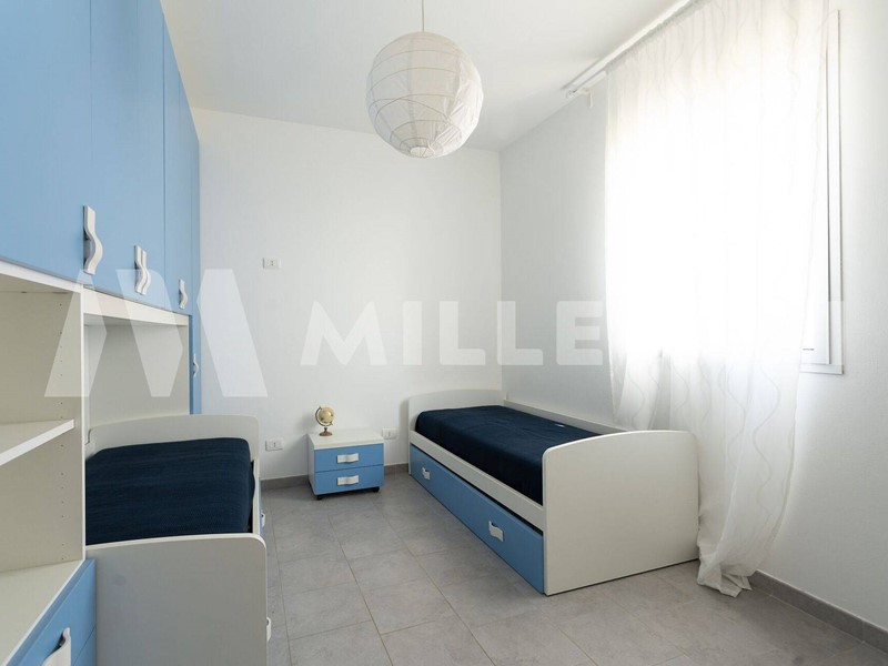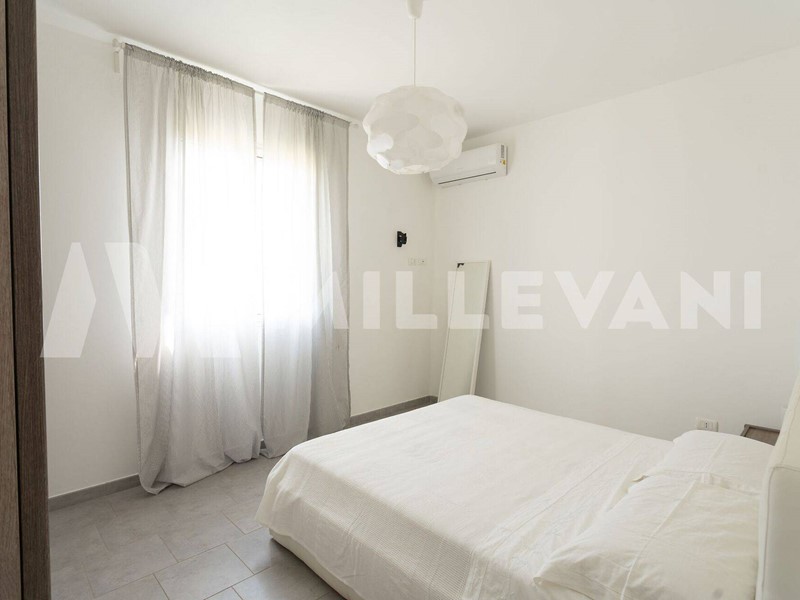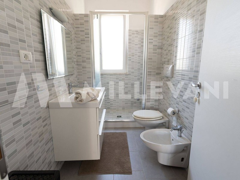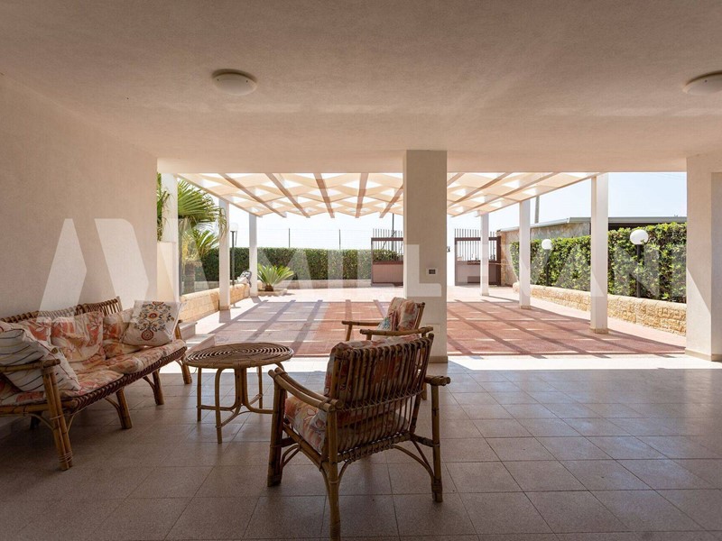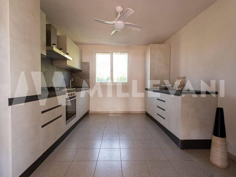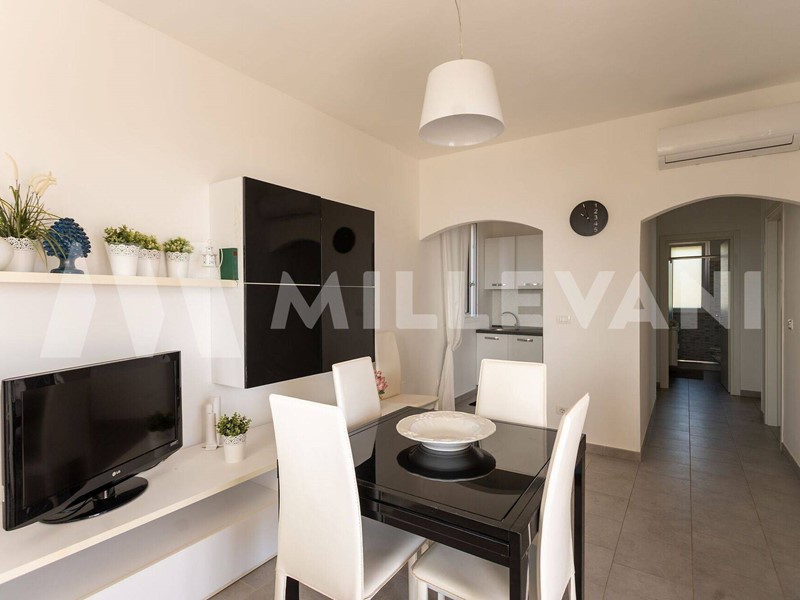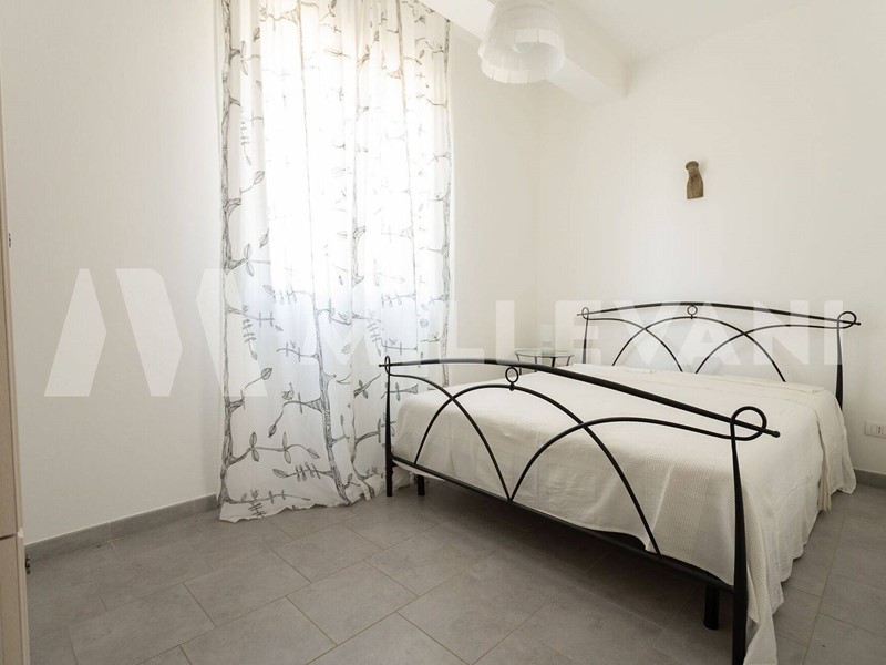 Dalla scala esterna si accede allappartamento principale di 100 mq circa, che presenta una graziosa veranda con vista unica sul mare e si compone allinterno di un living con cucina, 2 camere matrimoniali, una camera doppia e un bagno.