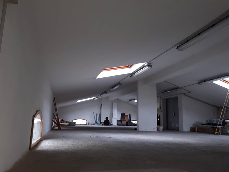L'immobile su strada secondaria è composto da tre piani con scala e montacarichi di 200 mq ciascuno, l'ultimo finestrato con tetto a spioventi.
