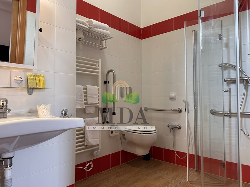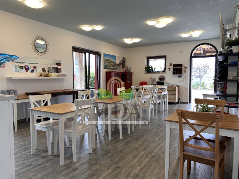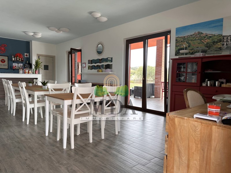 Il piano terra, 255 mq. circa, al quale si accede attraverso un portico, è suddiviso in: reception, sala colazione/ristorante, bar, bagno per gli ospiti, cucina, spogliatoio con bagno e doccia.