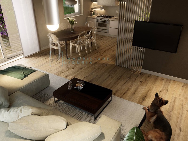 All'ingresso, un ampio e luminoso locale ospita la zona giorno, dotata di aperture prospicienti il giardino circostante, nel quale albergano due ulivi secolari e dal quale la vista si perde fino al mare.