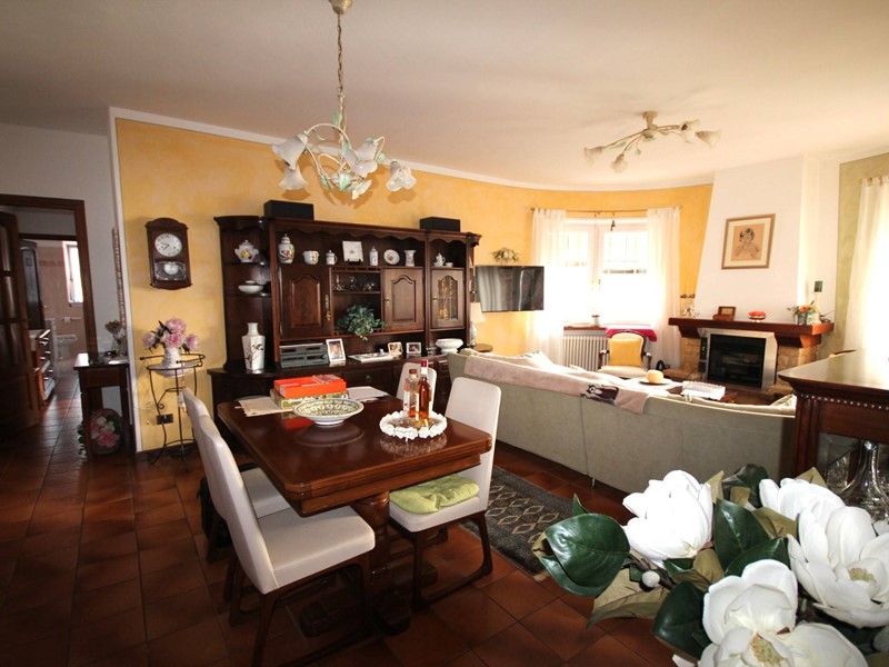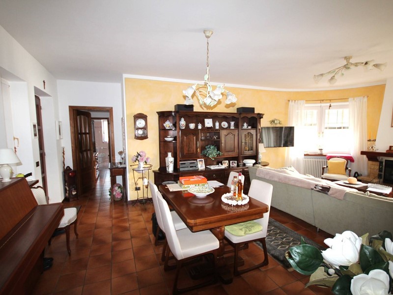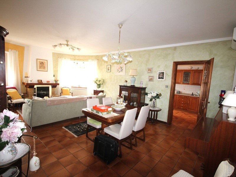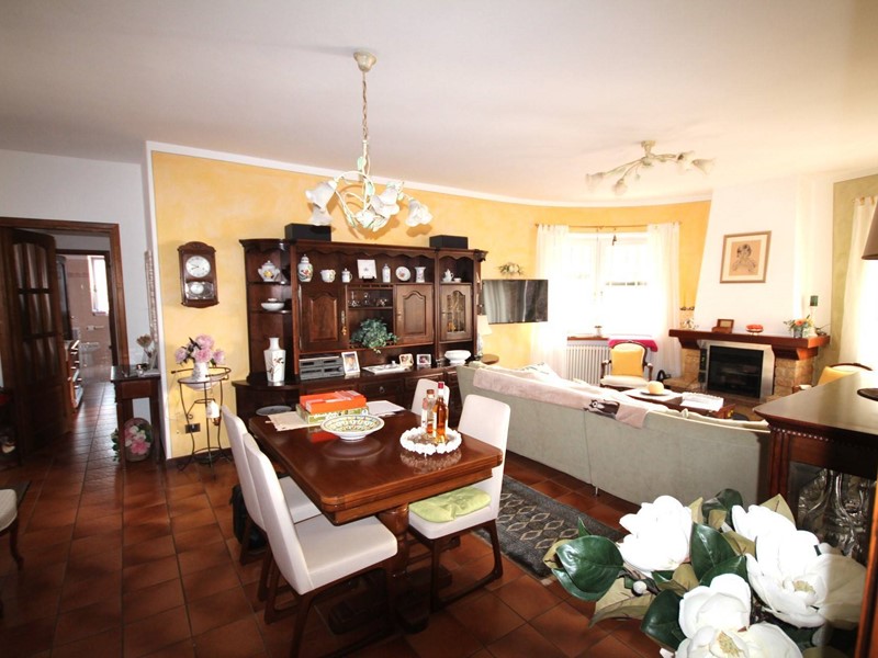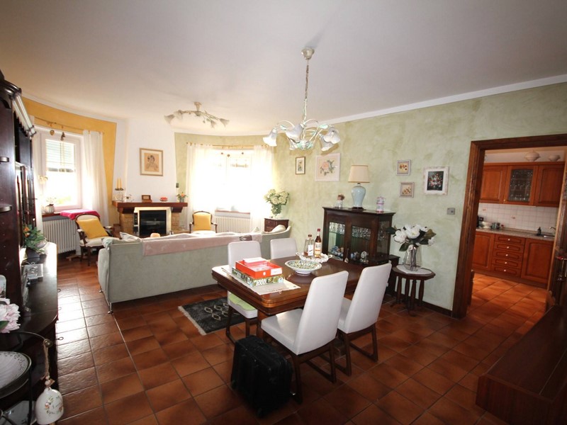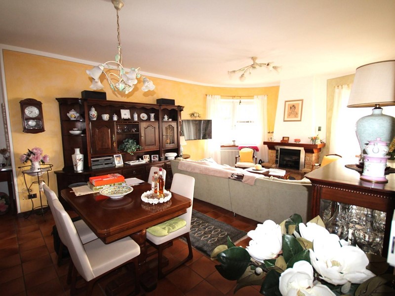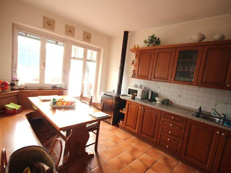 Lingresso si apre sull elegante soggiorno che ha una forma semicircolare, il camino centrale rafforza la sua caratteristica di accoglienza; alla destra troviamo una spaziosa cucina abitabile che ha accesso diretto allampia terrazza, anchessa vista lago. In cucina cè una termo-stufa a legna: un bel mix di moderna tecnologia e atmosfera di tempi passati.