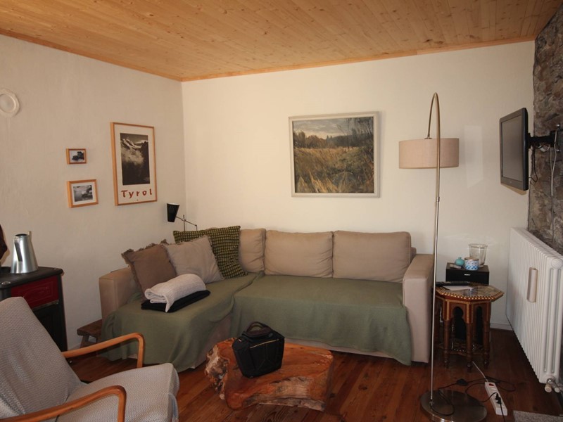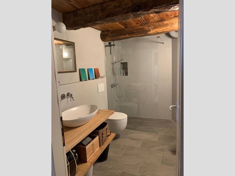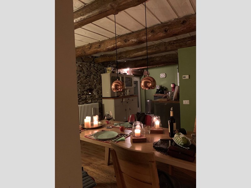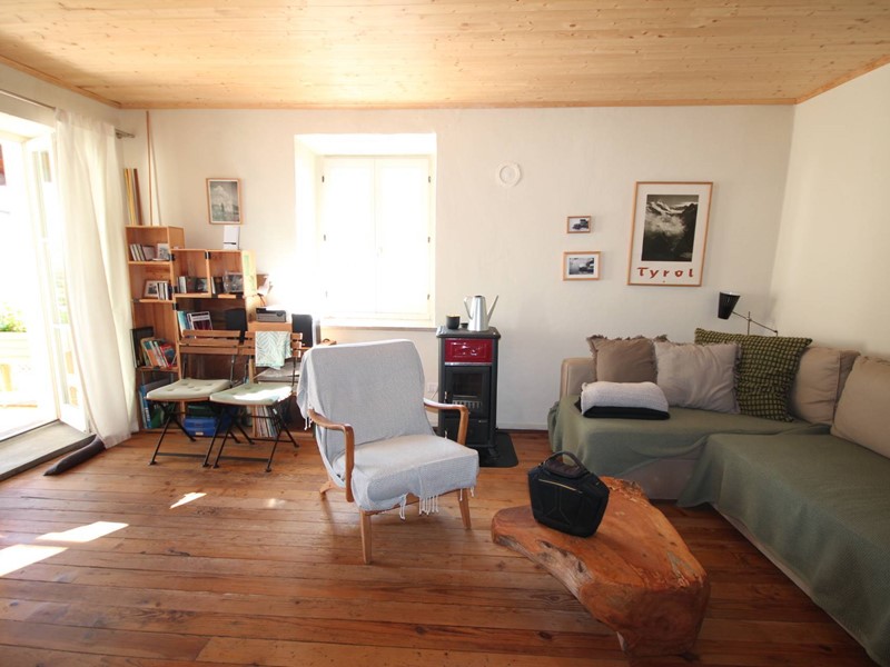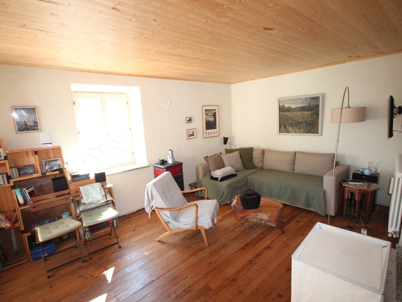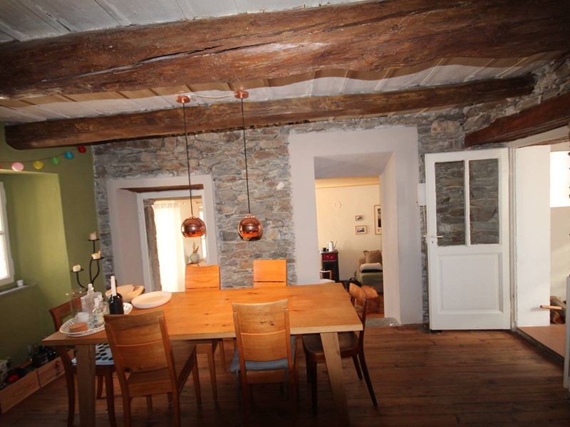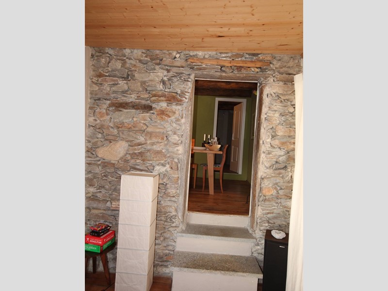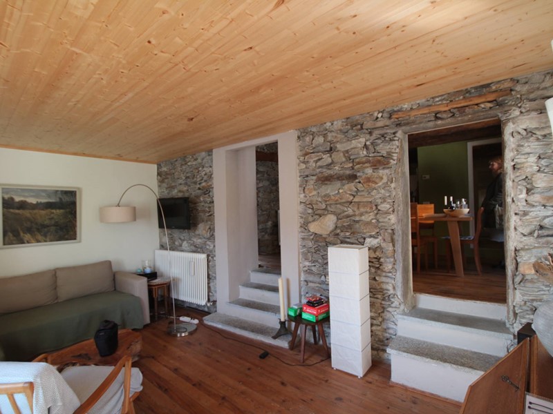 Gli spazi abitativi sono stati ristrutturati con cura e originalità e sono collegati da aperture e gradini in sasso. Il pavimento in legno, i travi a vista e le antiche pareti in sasso creano un ambiente unico ed una atmosfera molto calda.