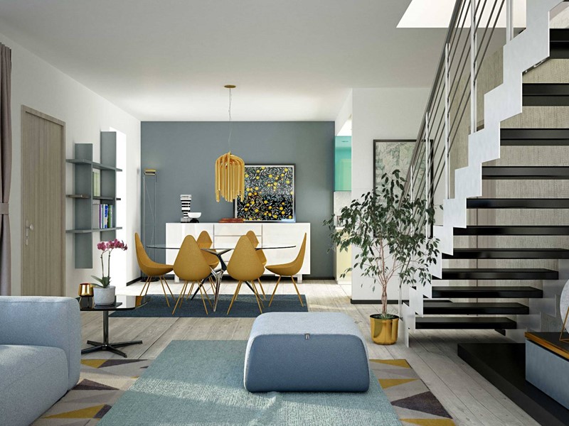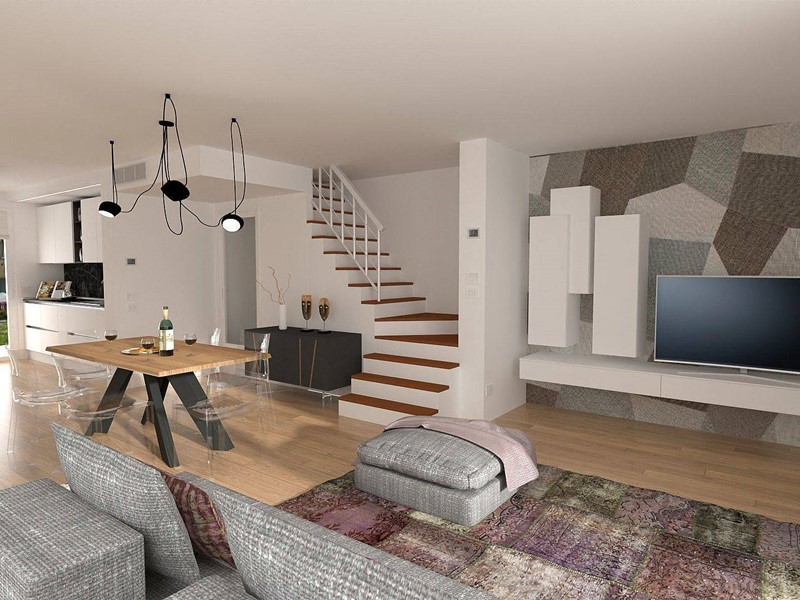 Piano terra: ingresso, ampio e luminoso soggiorno con cucina a vista ,disimpegno, primo bagno finestrato e accesso diretto a BOX singolo di 15mq.