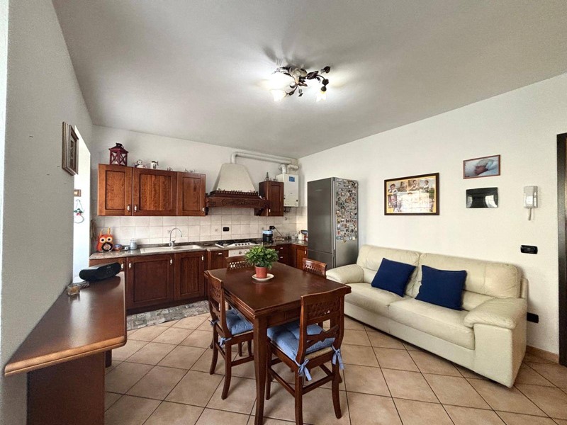 L'appartamento si apre su una luminosa zona giorno con cucina a vista, creando uno spazio accogliente e ben distribuito.