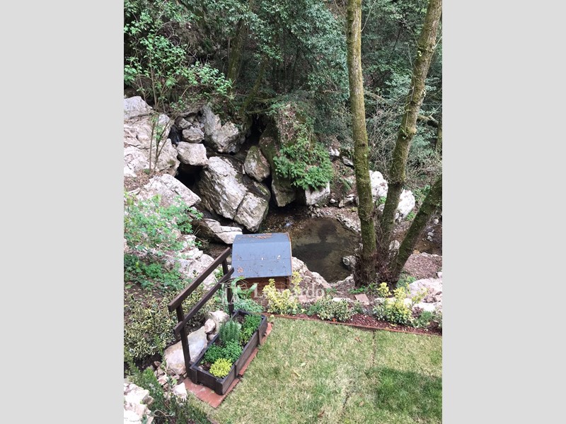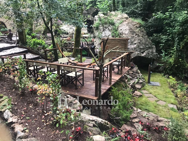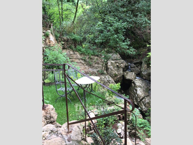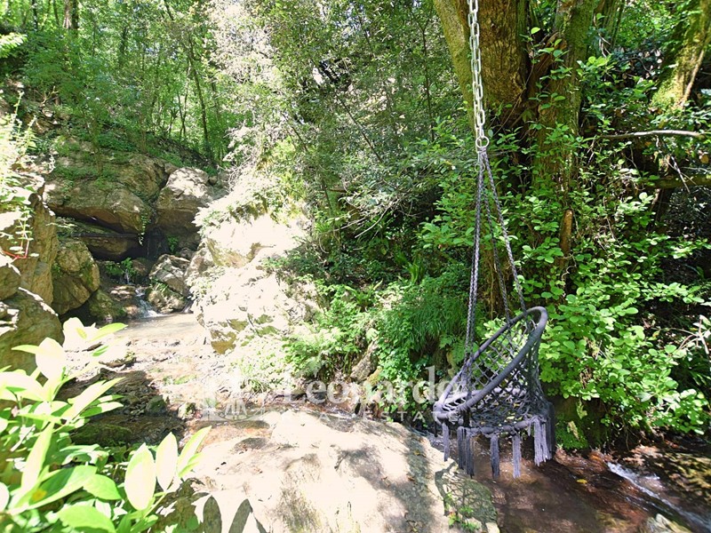 La ristrutturazione curata nei minimi dettagli ha recuperato ogni spazio anche all'esterno, dalle rocce che diventano parte del paesaggio del giardino, dalle altalene che oscillano sopra l'acqua, alle zone per pranzare all'aperto in riva al torrente, fino all'antico bottaccio, la vasca che raccoglieva i residui della lavorazione delle olive, che tramite una deviazione diventa una fresca piscina naturale rendendo questo scorcio di natura e lavoro dell'uomo un connubio unico e magico dove ogni pietra o angolo degli oltre 7000 mq di terreno e bosco raccontano qualcosa.