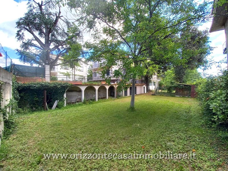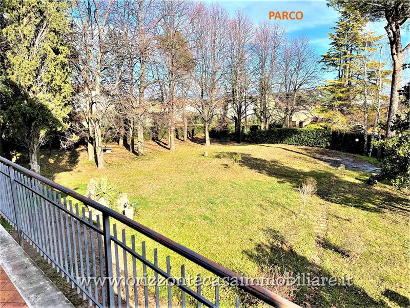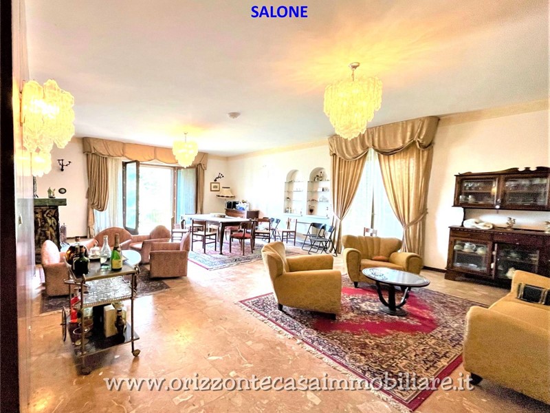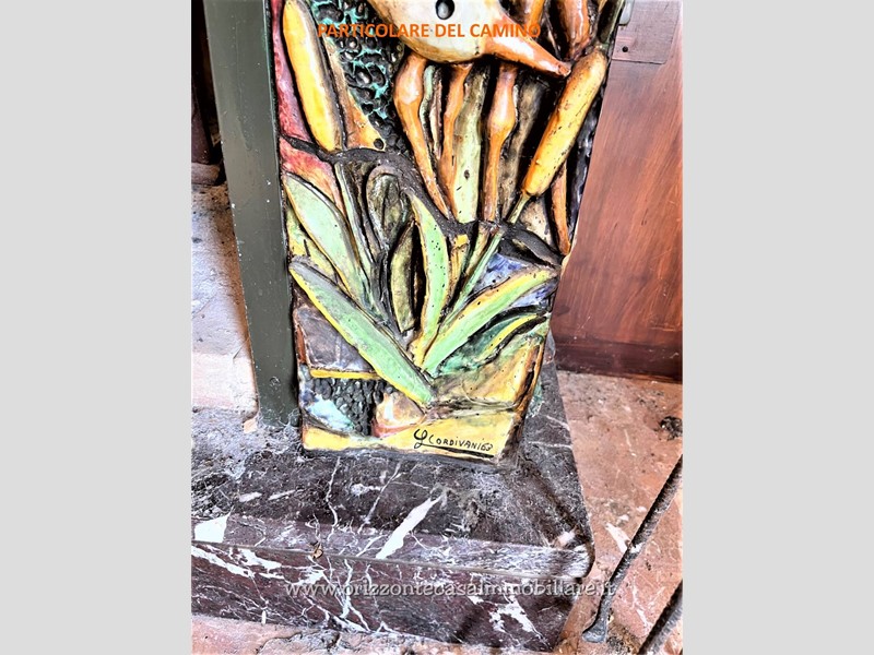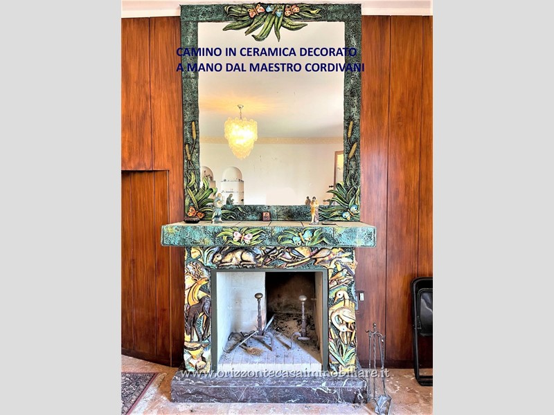 PRIMO PIANO: ampio disimpegno, un grande ed elegantissimo soggiorno di circa 50 mq, molto luminoso e con finiture di pregio (è presente un camino con base di marmo e rivestito con ceramica decorata a mano dal maestro Cordivani), una cucina abitabile con soggiorno e camino, 2 camere da letto con pavimento in parquet e 2 bagni; da questo livello si può accedere sia al grande parco privato retrostante il fabbricato, sia ad un altro grande giardino piantumato che si trova fronte strada.