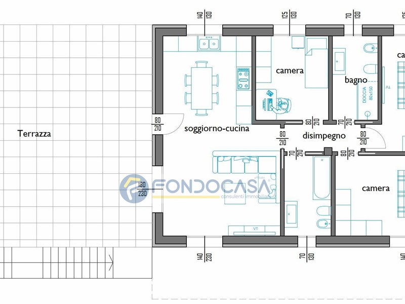 L'immobile è cosi composto: ingresso su Soggiorno con Cucina-Living, n.3 Camere da letto, n.2 Bagni, Terrazzo privato di circa 70 mq, Garage comodo e spazioso, ideale per un'auto e spazio aggiuntivo per deposito. Giardino privato.