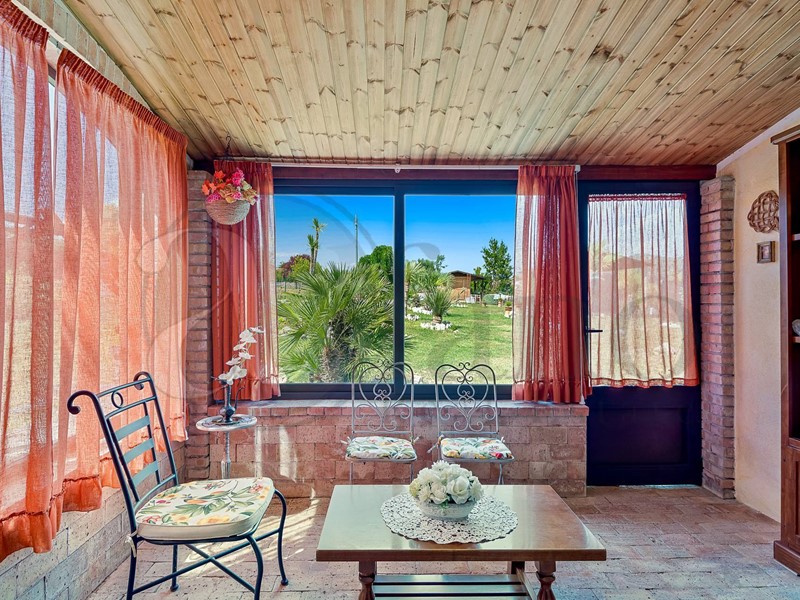 Completa il tutto un portico con veranda e giardino con piante verdi ed ornamentali.