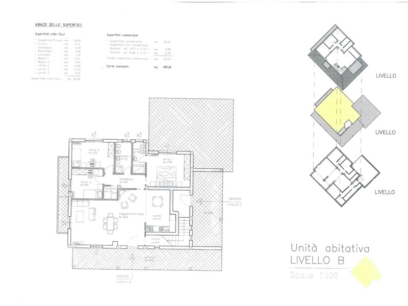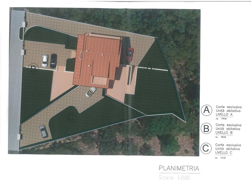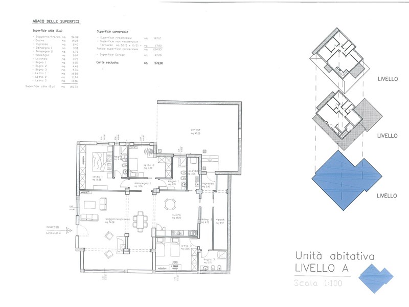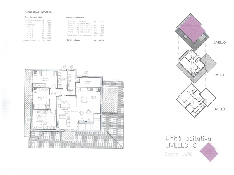 La terza soluzione, al primo piano con ingresso esclusivo, ha una superficie di circa 148 mq ed è composta da tre camere, una cucina abitabile, un ampio soggiorno, due bagni, un ripostiglio e un giardino esclusivo di 445 mq.