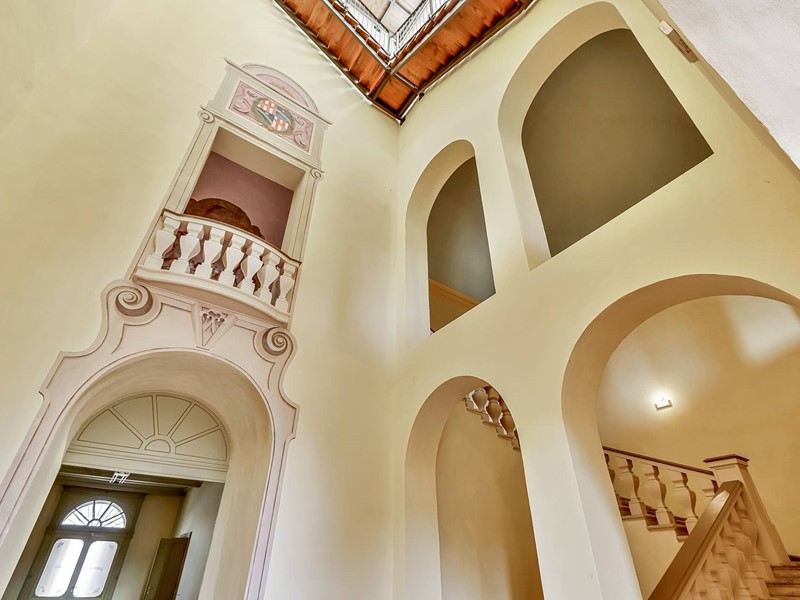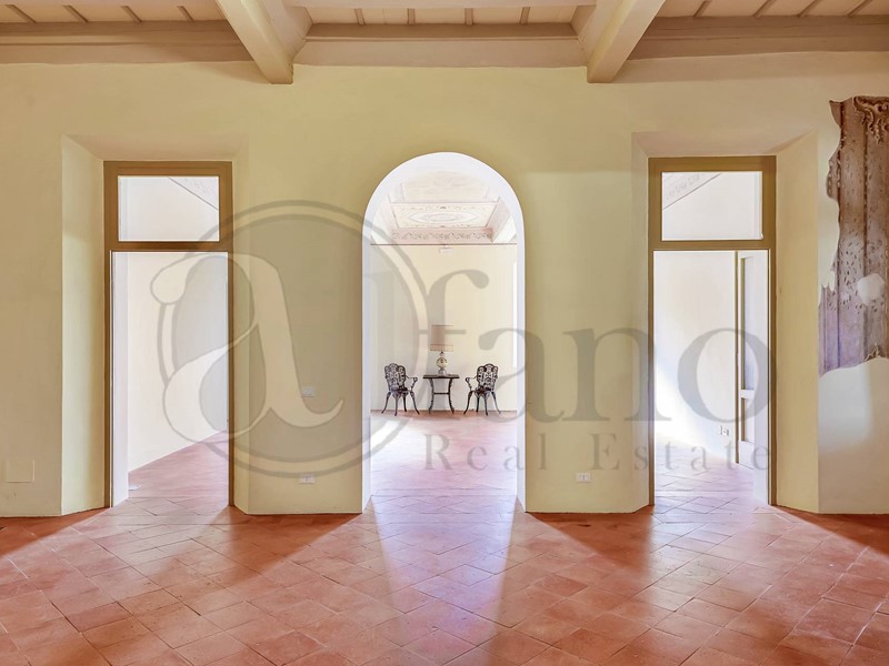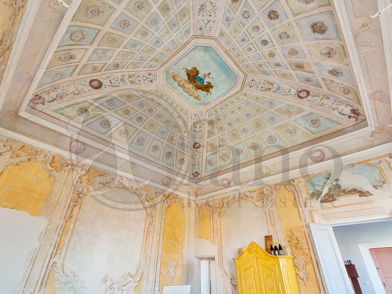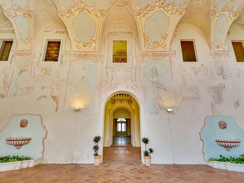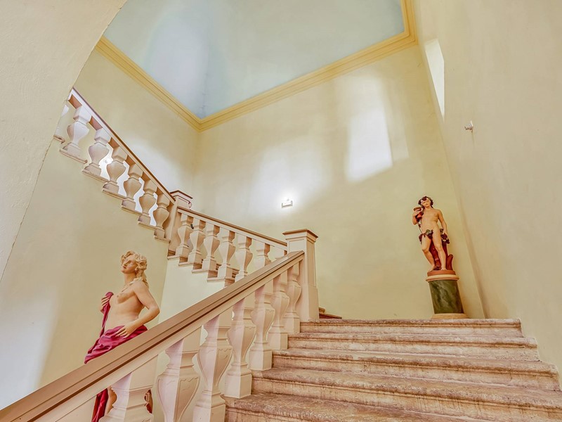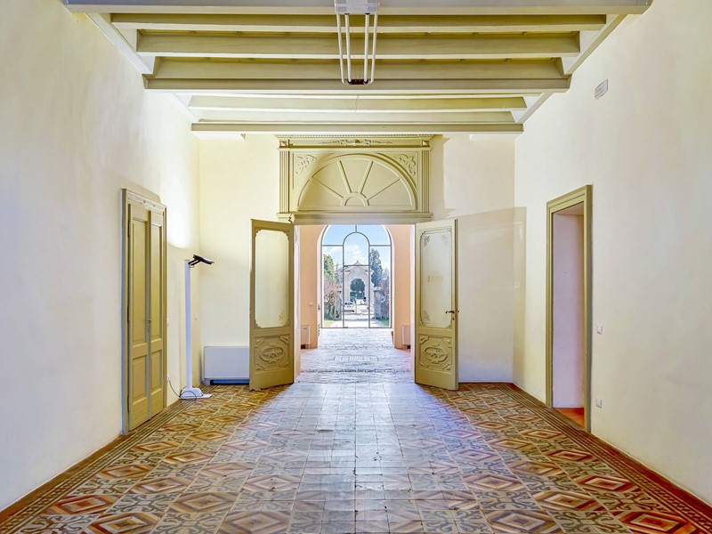 Il piano terra è caratterizzato da un sontuoso salone della musica con affreschi e finestre interne, pavimenti in cotto originale ed una scalinata con balconcino interno che affaccia sulla zona di accoglienza della villa. La scalinata in pietra antica è impreziosita da statue di Venere e da antichi poggiamano che portano al piano superiore dove inizia un percorso di stanze ampie, luminose e con decori in pietra e pareti affrescate. Alcuni pavimenti mantengono ancora lo stile settecentesco delle cementine colorate e dalle fantasie geometriche che rendono l'ambiente raffinato e unico nel suo genere.