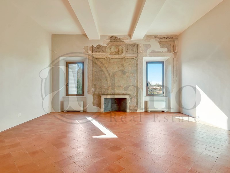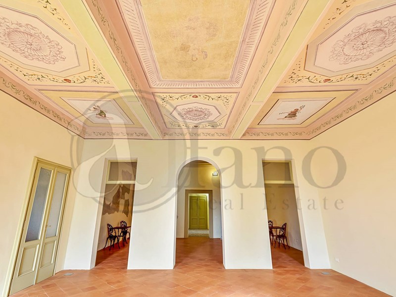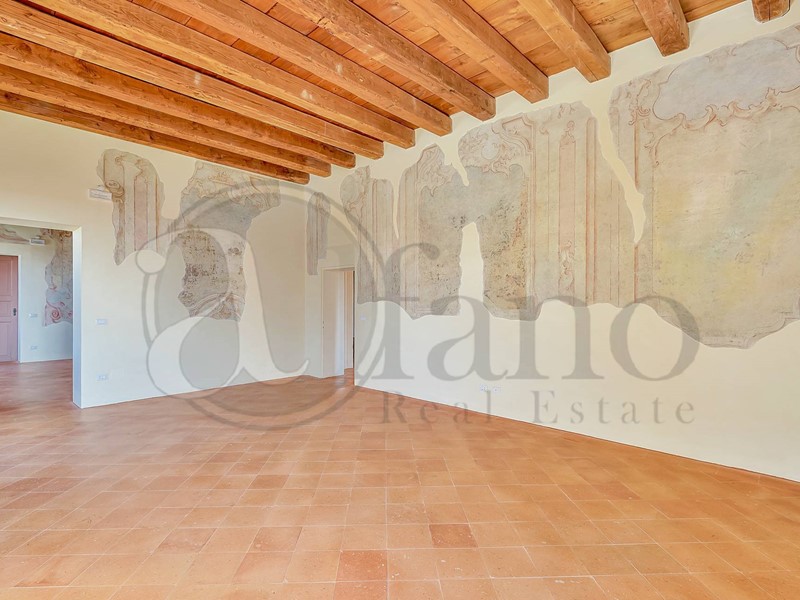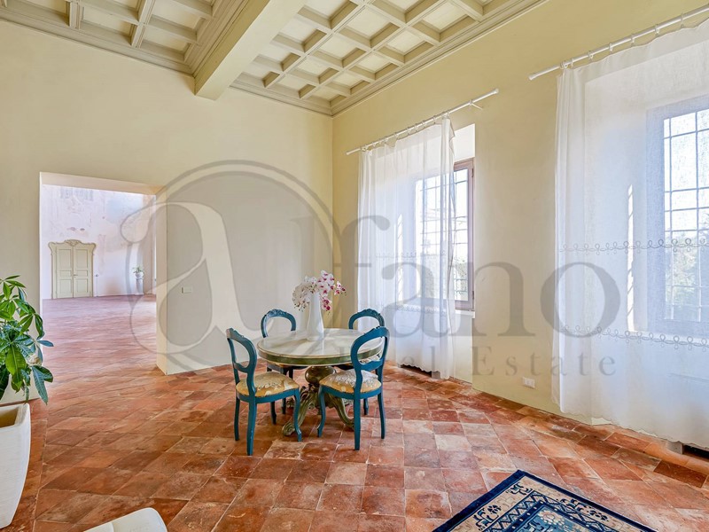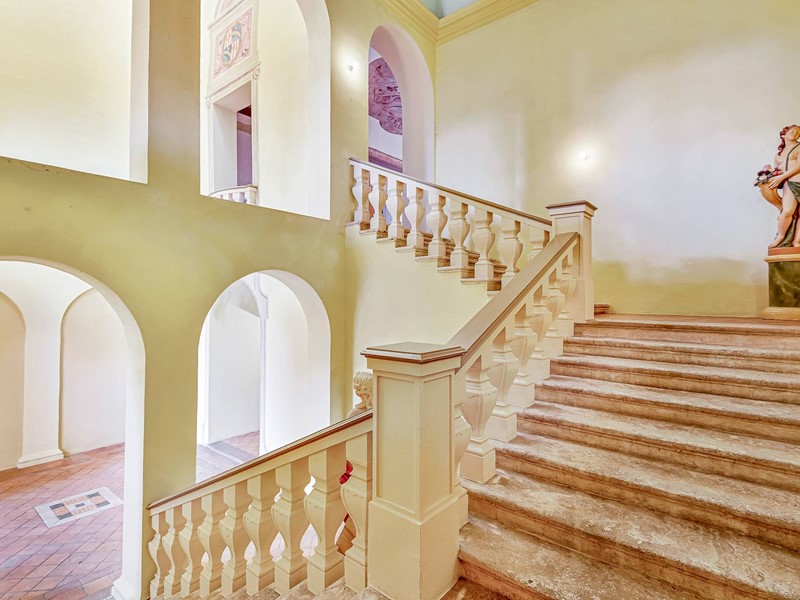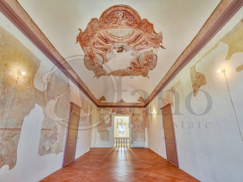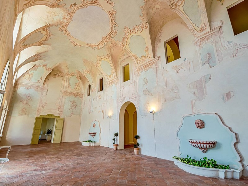 Il piano terra è caratterizzato da un sontuoso salone della musica con affreschi e finestre interne, pavimenti in cotto originale ed una scalinata con balconcino interno che affaccia sulla zona di accoglienza della villa. La scalinata in pietra antica è impreziosita da statue di Venere e da antichi poggiamano che portano al piano superiore dove inizia un percorso di stanze ampie, luminose e con decori in pietra e pareti affrescate. Alcuni pavimenti mantengono ancora lo stile settecentesco delle cementine colorate e dalle fantasie geometriche che rendono l'ambiente raffinato e unico nel suo genere.