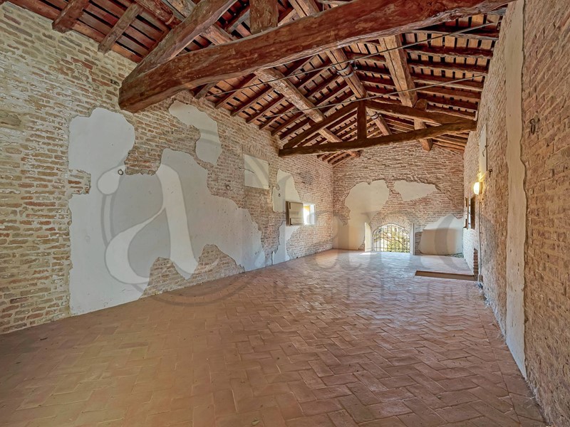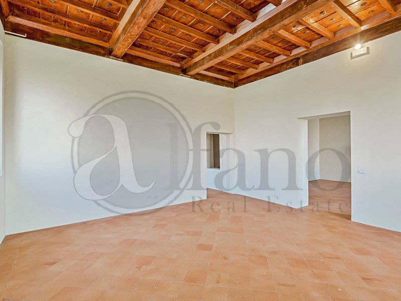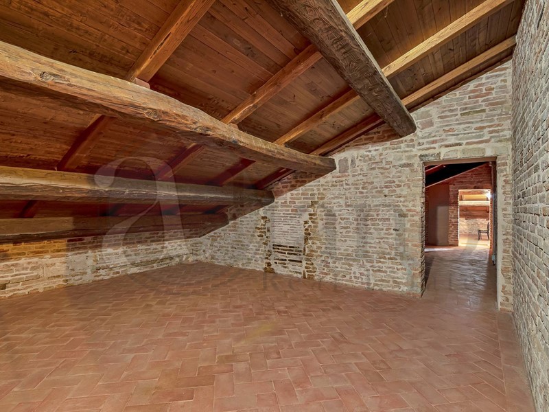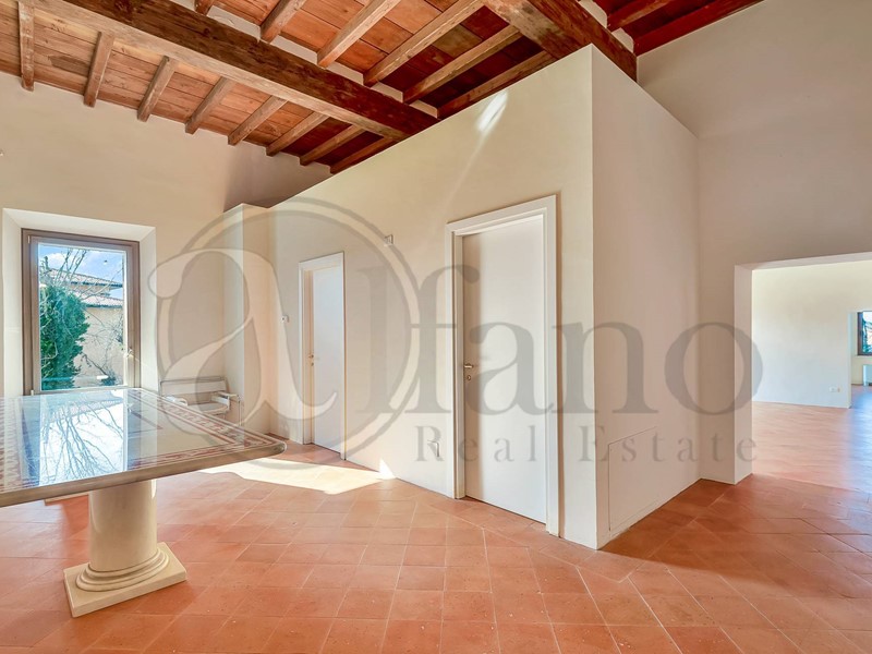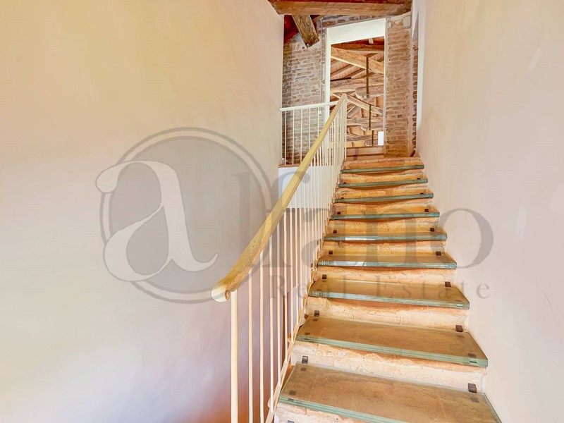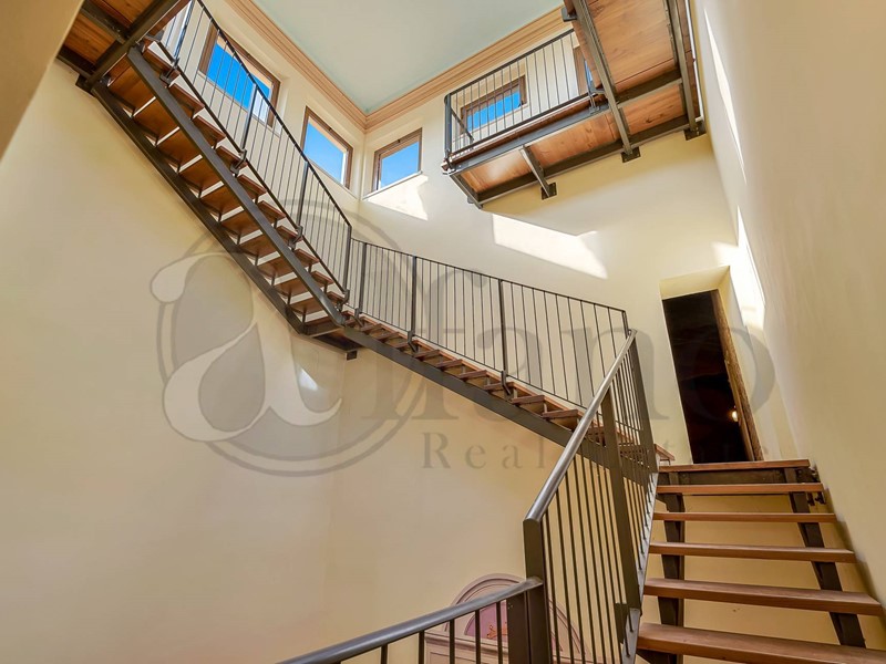 Attraverso una geometrica scalinata in legno con affaccio interno sull'atrio principale del piano terra si raggiunge il secondo piano dove possiamo ammirare uno degli ambienti più caratteristici dell'intera villa, un salone con alti soffitti con travi a vista in legno perfettamente restaurati e in ottimo stato di conservazione con le pareti in mattoncini di pietra locale.