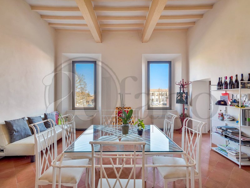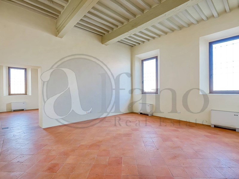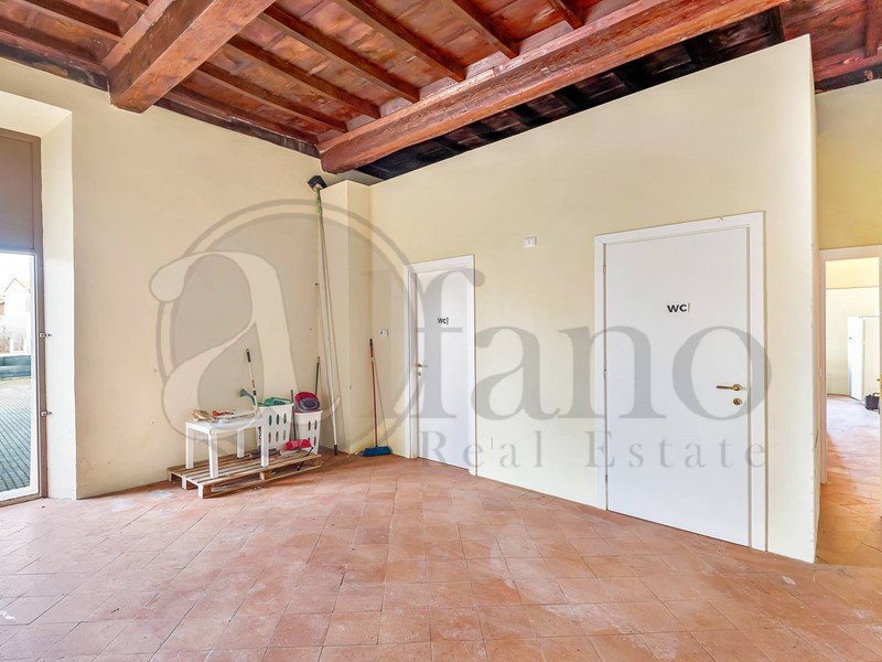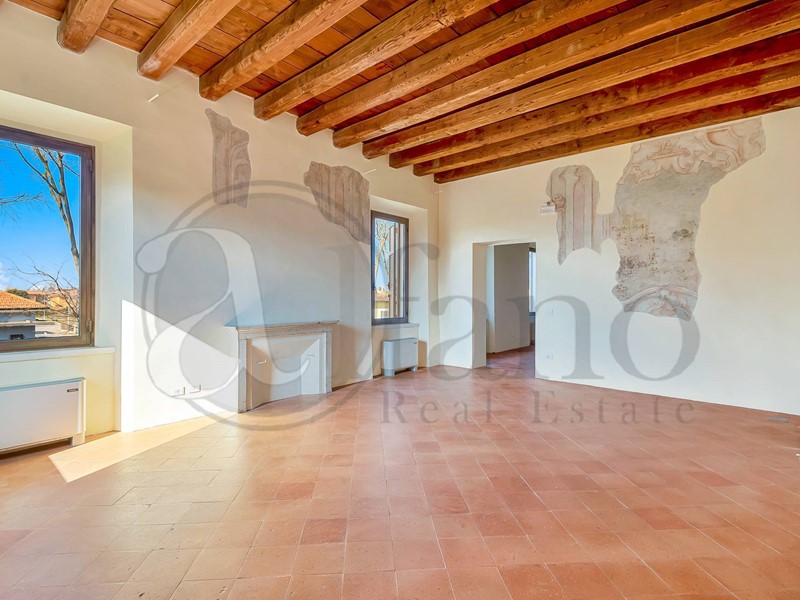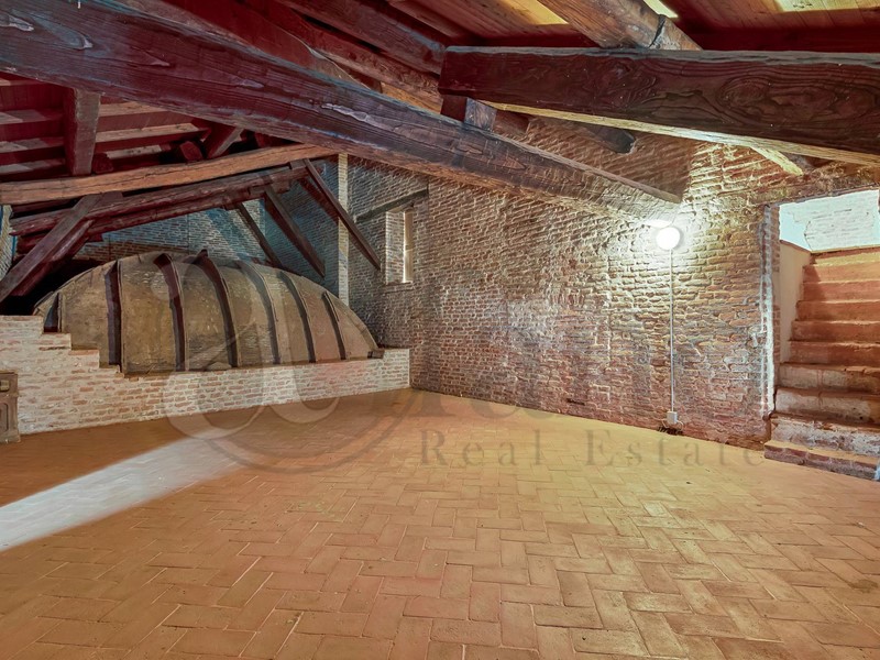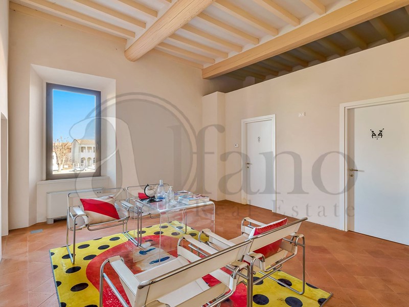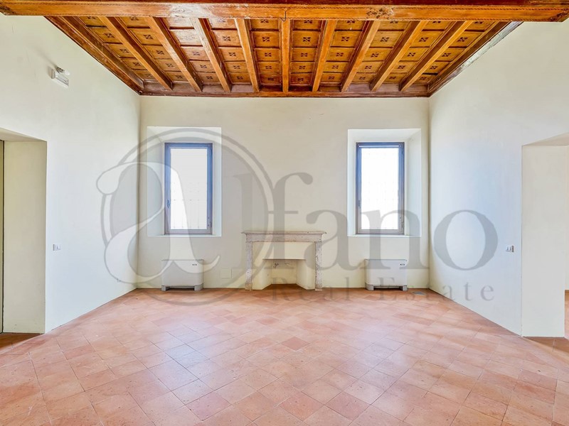 Attraverso una geometrica scalinata in legno con affaccio interno sull'atrio principale del piano terra si raggiunge il secondo piano dove possiamo ammirare uno degli ambienti più caratteristici dell'intera villa, un salone con alti soffitti con travi a vista in legno perfettamente restaurati e in ottimo stato di conservazione con le pareti in mattoncini di pietra locale.