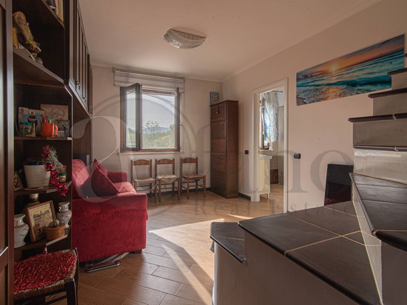 Al piano terra, troviamo una spaziosa zona living con cucina a vista, divano e stufa a pellet, collegata ad una camera matrimoniale, comoda e di facile accesso ad un bagno (in camera).