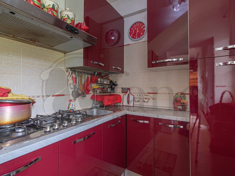 Il salone comunica con una cucina, accessoriata e moderna dal colore rosso bordeaux.
