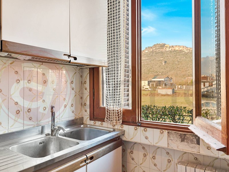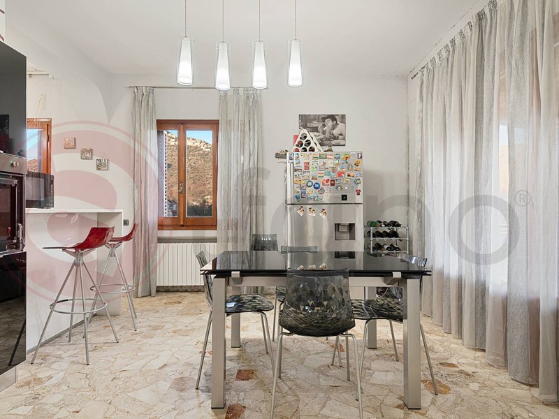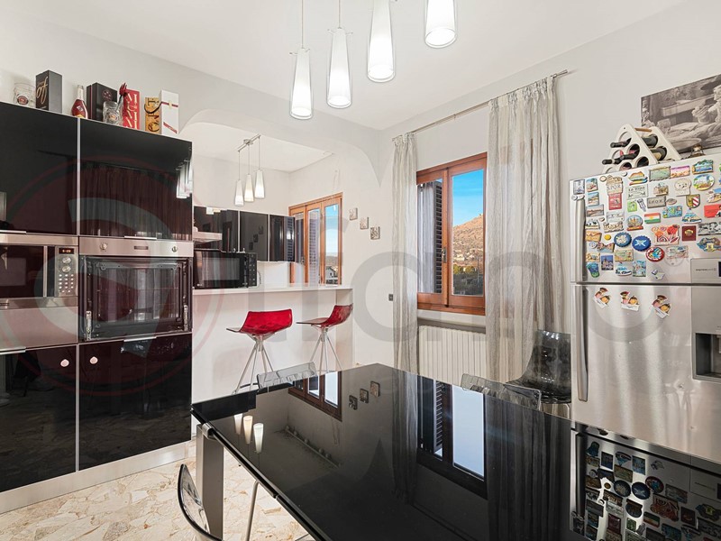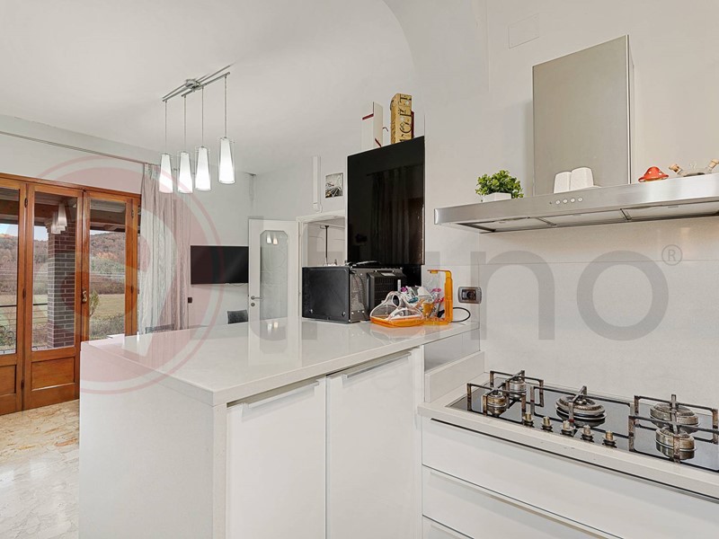 La cucina, completamente attrezzata e moderna, offre ampi spazi per preparare deliziosi pasti e gode di una splendida vista panoramica sulla vallata circostante.