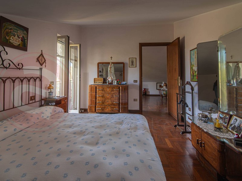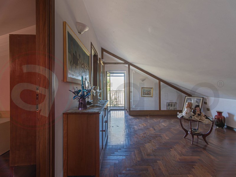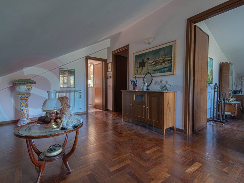 Tramite la caratteristica scala in legno interna, si può accedere al primo piano, interamente pavimentato in parquet, dove ci accoglie un ampio disimpegno / studio, due camere da letto, secondo servizio e balcone.