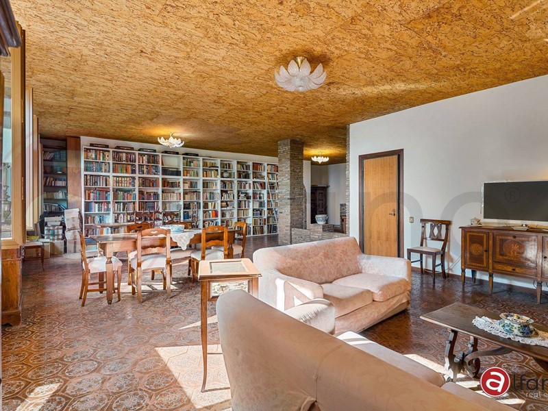 Accanto all'ingresso, un ampio studio luminoso, con quattro finestre in linea, regala un affaccio sul verde circostante.