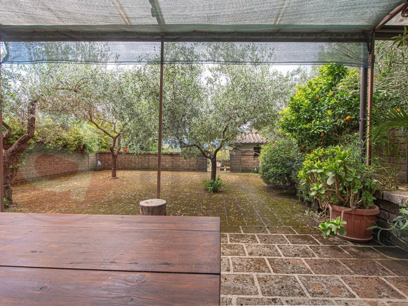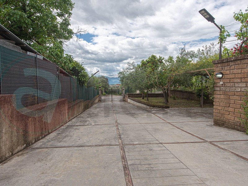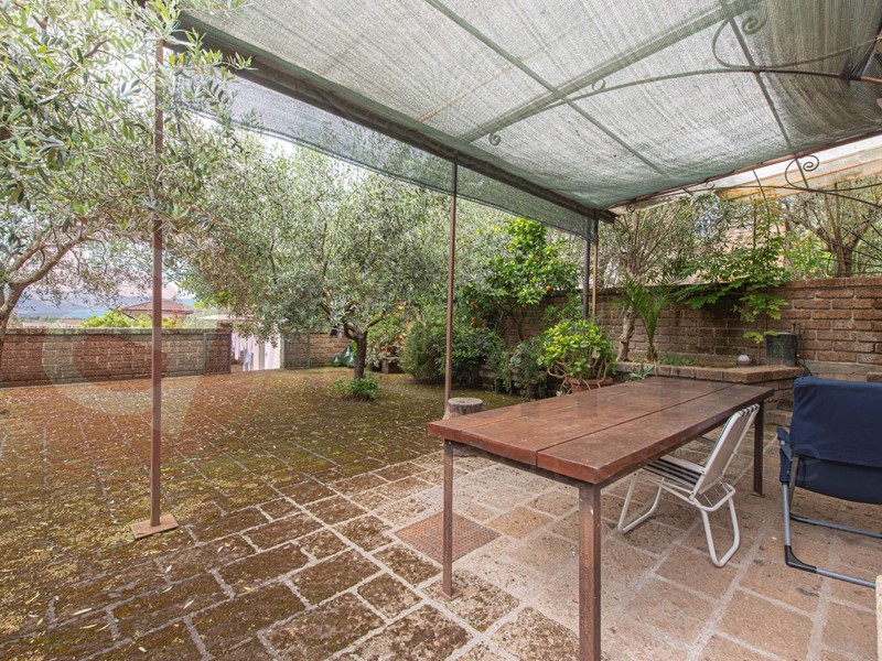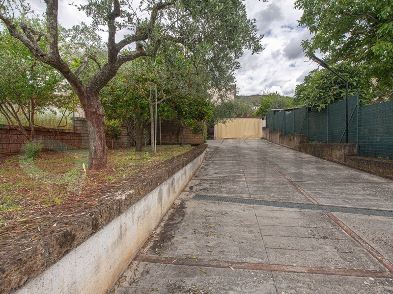 Il giardino è di fatto composto da due grandi terrazzamenti, il secondo ingresso è carrabile con cancello elettrico, che apre ad un piazzale pavimentato dove sono presenti due posti auto coperti da una struttura in legno. Qualche gradino sopra, c'è un piccolo deposito di circa 10 mq, utilizzato come vano caldaia e rimessa oggetti.