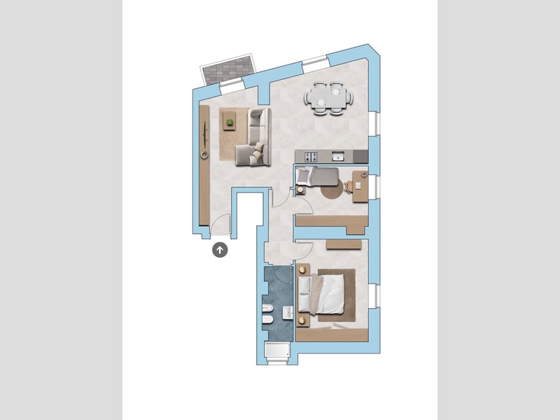 Gli infissi, attualmente con singolo vetro, possono essere facilmente sostituiti per garantire un miglior isolamento termico e acustico. La soluzione è proposta non arredata, lasciando ampia libertà di personalizzazione agli acquirenti.