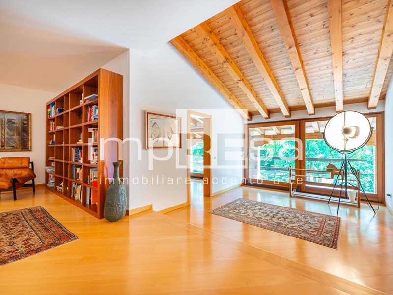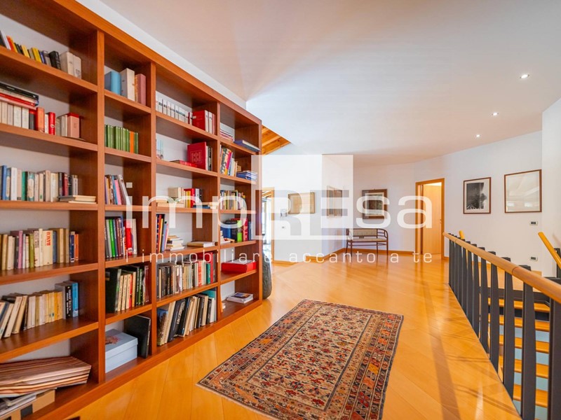 - piano primo: ampio disimpegno con scala di collegamento al piano inferiore, prezioso affaccio sul giardino piantumato, camera con guardaroba e bagno, camera con bagno, ripostiglio, camera e terrazza.
