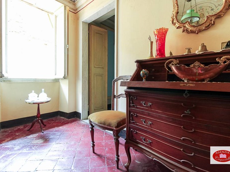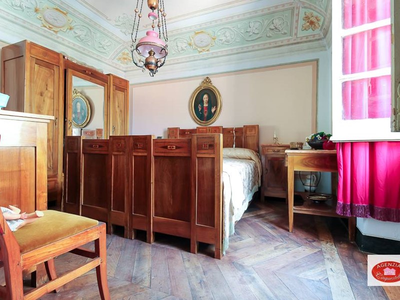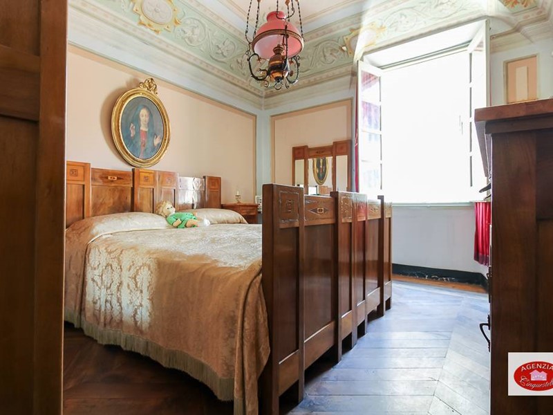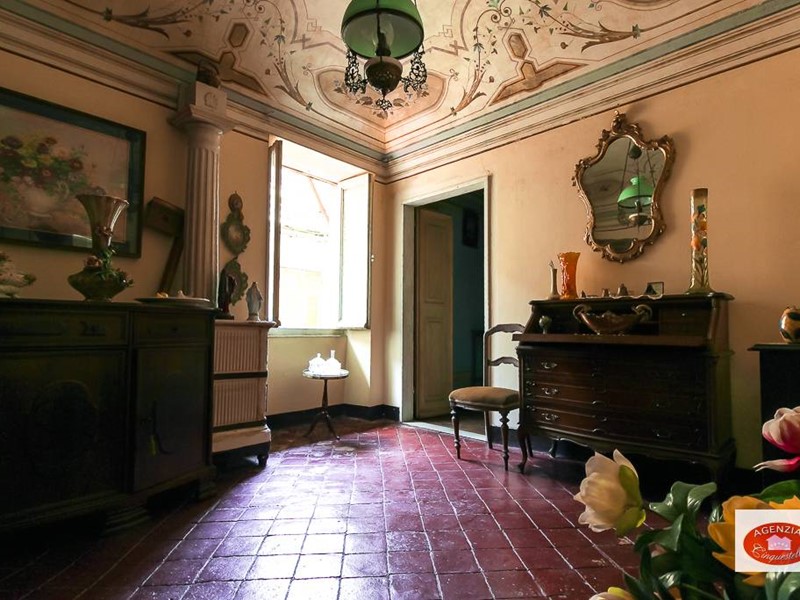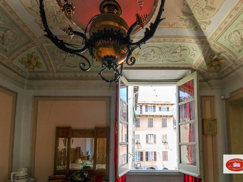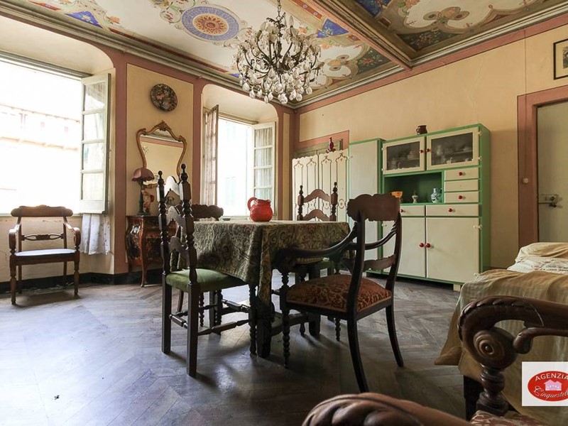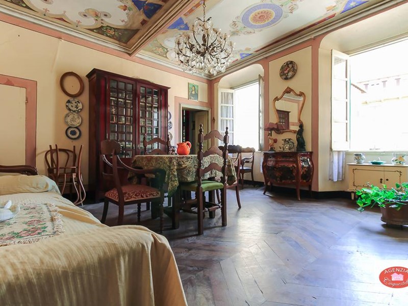 Appartamento unico in vendita a Sassello, nel centro storico del paese, di fronte al calzaturificio di Stefano Pesce, al secondo piano di un palazzo d'epoca disposto sull'unico piano, composto da due alloggi uniti in un unico grande immobile composto da un grande soggiorno d'ingresso con tre camere che danno sulla via principale Via Umberto I e la cucina con altre due camere che danno sul vicolo parallelo posteriore "senza nome"